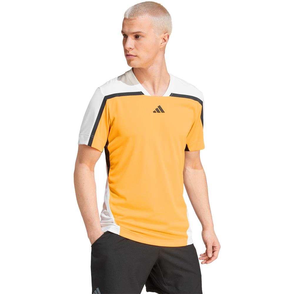 Sweat it out on court while remaining comfortable. Maintain your intensity on the court during hot and humid conditions. This adidas t-shirt is made with HEAT.RDY to keep you cool and energized when the sun's beating down. Designed for players who don't stop, this tee offers unrestricted range of motion through the arms and shoulders so you can crush forehands and chase down drop shots.