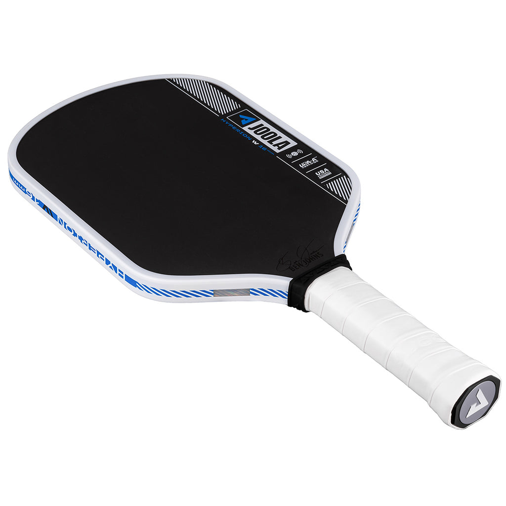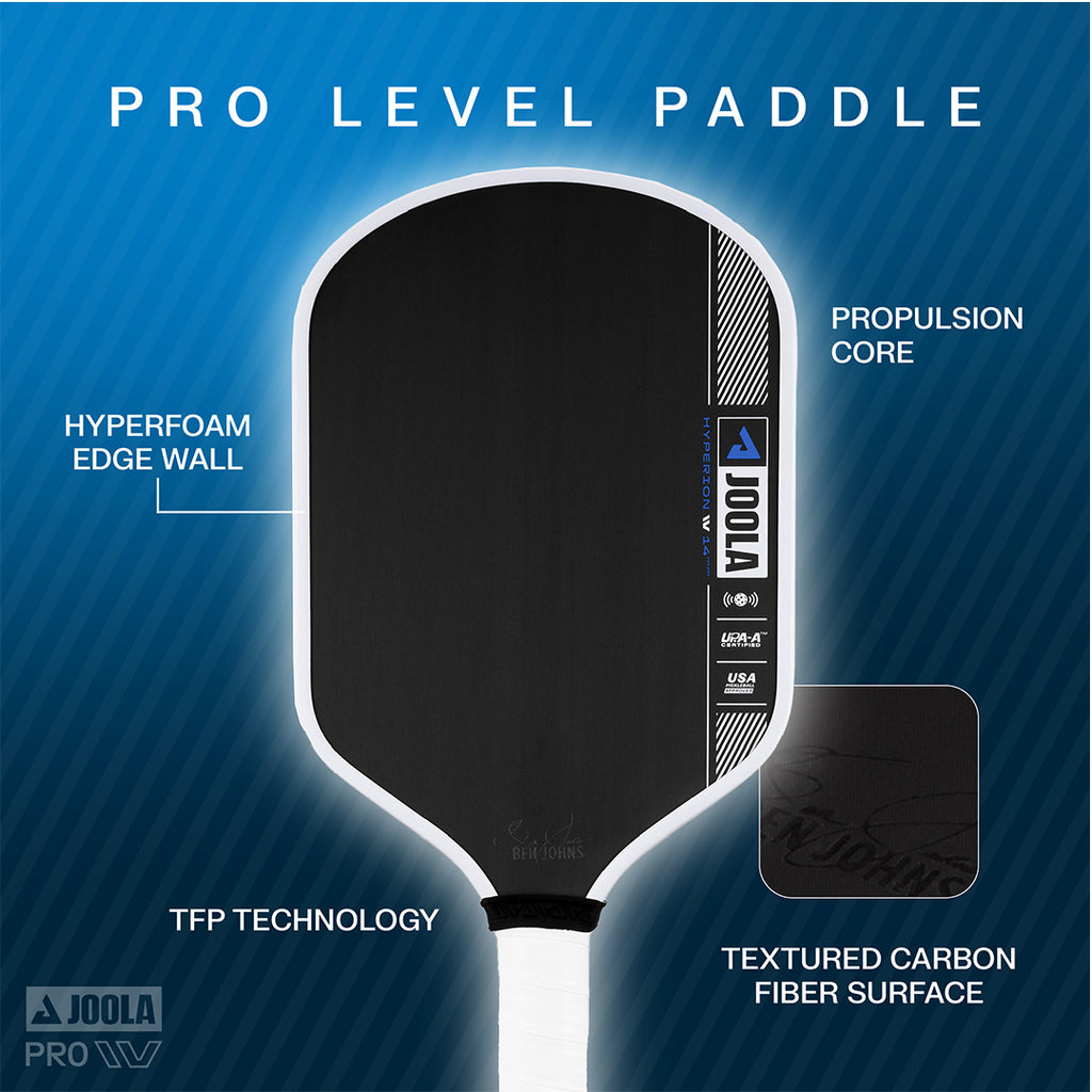 Swing fast and blister those shots past your opponent with a 16mm frame. The aerodynamic shape of the Hyperion Pro IV pickleball paddle cuts through the air faster for less drag time and increased swing speed. Now with JOOLA’s patent-pending TechFlex Power (TFP) technology, the weight has been optimized throughout the paddle, reducing fatigue, and offering the confidence you need to understand your unique play style. By combining TFP with the innovative Propulsion Core, Pro IV gives you power with unparalleled forgiveness to help you put every shot in play. The paddle that started it all features the longest handle in Joola’s lineup, providing players with enhanced leverage to achieve the perfect balance of spin and control. All Pro IV paddles are USAP PBCoR 43 certified and UPA-A pro certified.