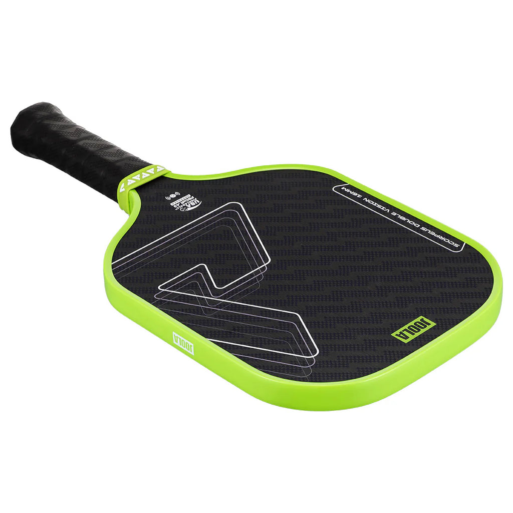 With a wider body, make more consistent contact. Experience the performance of the new JOOLA Scorpeus Double Vision 16mm. With a new aramid surface material, the Scorpeus Double Vision enhances durability and impact resistance while providing a softer feel for improved touch and control. Inside, JOOLA integrates SK Film, a layer of foam placed between the paddle’s surface and core, to dampen vibrations. A thermoforming process from the paddle's handle through the neck enhances stability and flexibility, generating more power with every shot. The Scorpeus Double Vision is USAP PBCoR.43 Certified.