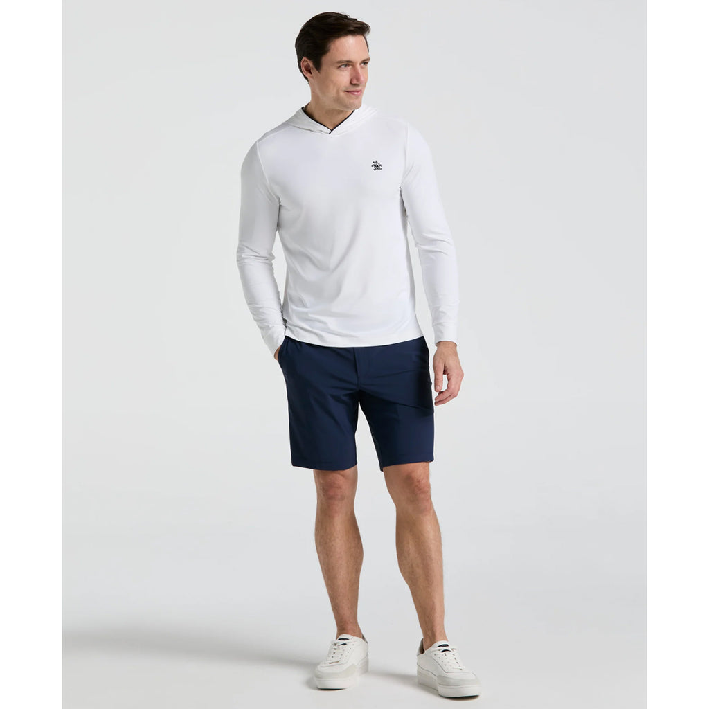Stay warm when playing in the chilly outdoors. Be prepared for chilly days on the golf course with this Original Penguin performance men's golf top. Long sleeves and a hood make this shirt the perfect base layer golf top to keep you warm and protected from the elements. Single knit fabrication is lightweight, while added stretch delivers a comfortable fit with flex. Moisture-wicking properties ensure you feel dry even when your game heats up.