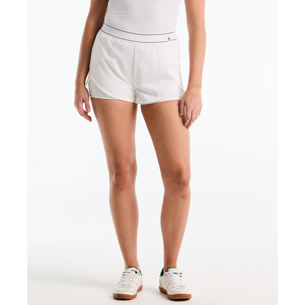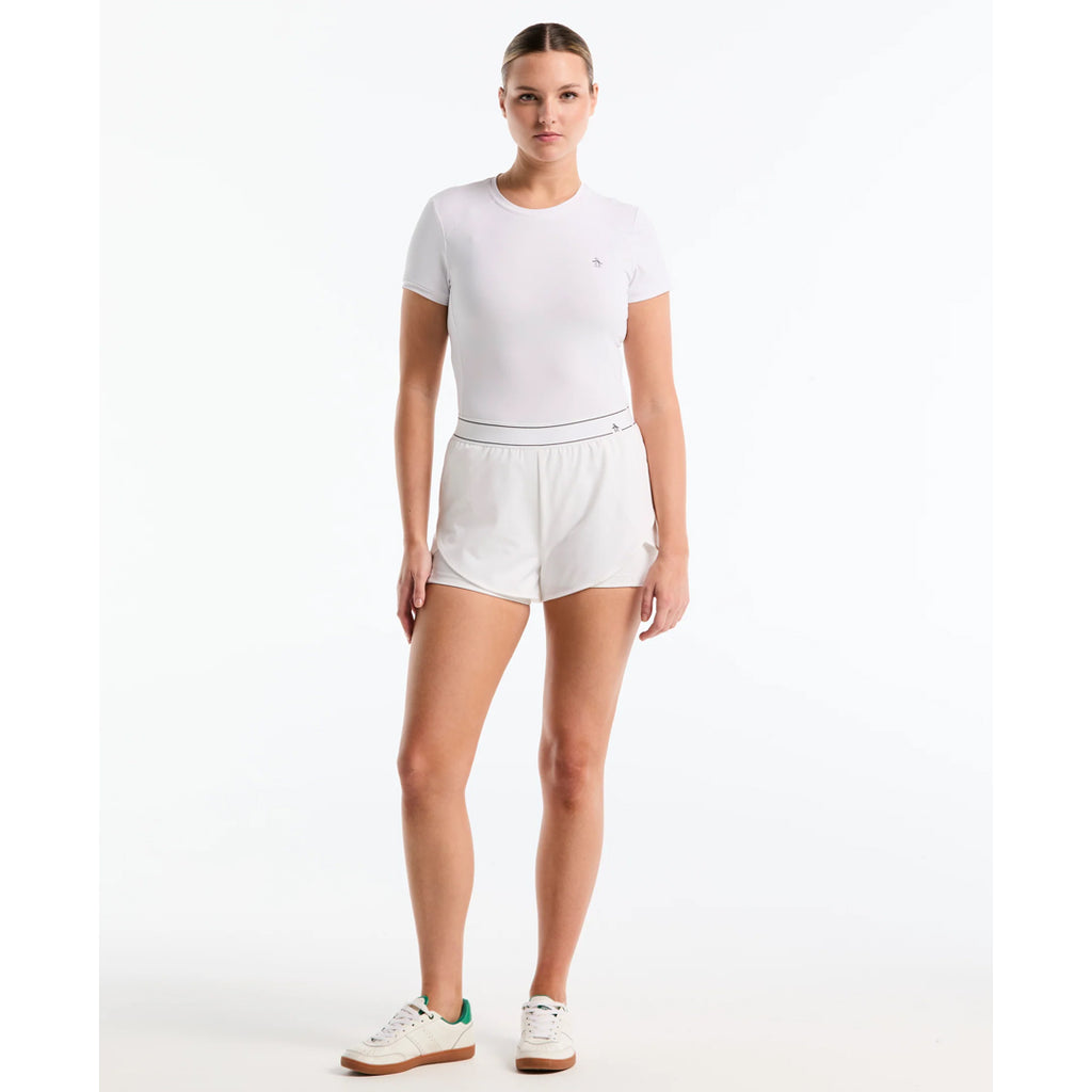 Classic white tennis short with all that authentic Penguin style. Ace your on-court look with these dynamic women's tennis shorts from Original Penguin. Crafted with a twill fabrication and enhanced with incredible stretch, these shorts let you move with unrestrained agility. Feel cool and fresh with moisture-wicking technology that handles the heat of your toughest matches. The built-in liner offers added comfort and coverage, while the elastic waistband ensures a secure, personalized fit. Made from recycled polyester, these 3-inch inseam shorts combine performance and conscious creation, making them a perfect pick for your next game or practice session.