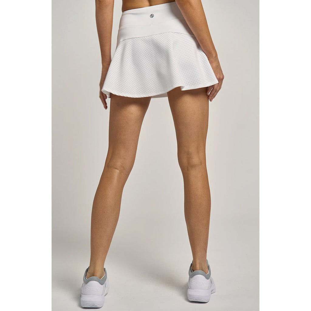 Classic white on an iconic Lija skort. Make every step look effortless in the Lift Skort, an a‑line design with a curved front seams that wrap to the back for a flattering, elongating line. Below the seam, laser‑cut perforated fabric adds breathable ventilation and a light, fluttery finish at the hem—so it moves beautifully through every swing. Crafted in LIJA’s Sportif fabric with four‑way stretch, moisture‑wicking, and quick‑dry performance, this skort delivers comfort and court‑to‑club style in one streamlined silhouette.