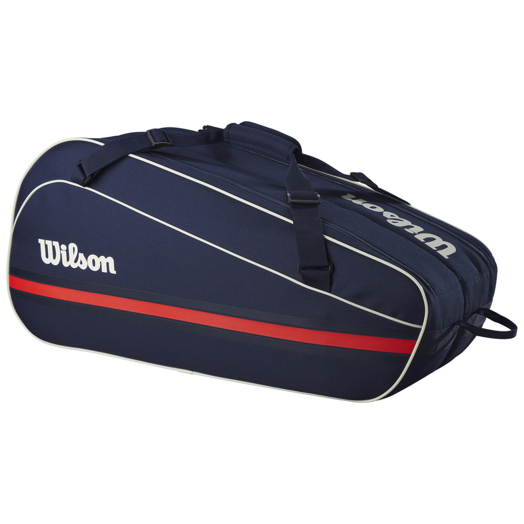 Carry the essentials to court in stylish navy. A great bag for club players looking to carry extra gear, the latest Team 6-Pack from Wilson provides room for up to six tennis racquets, apparel and other tennis essentials. In addition to the two main racquet compartments, there's a large outer zip pocket for stashing extra balls, grips and personal items. It's made from durable polyester with a top grab handle and adjustable shoulder straps for comfortable carrying.