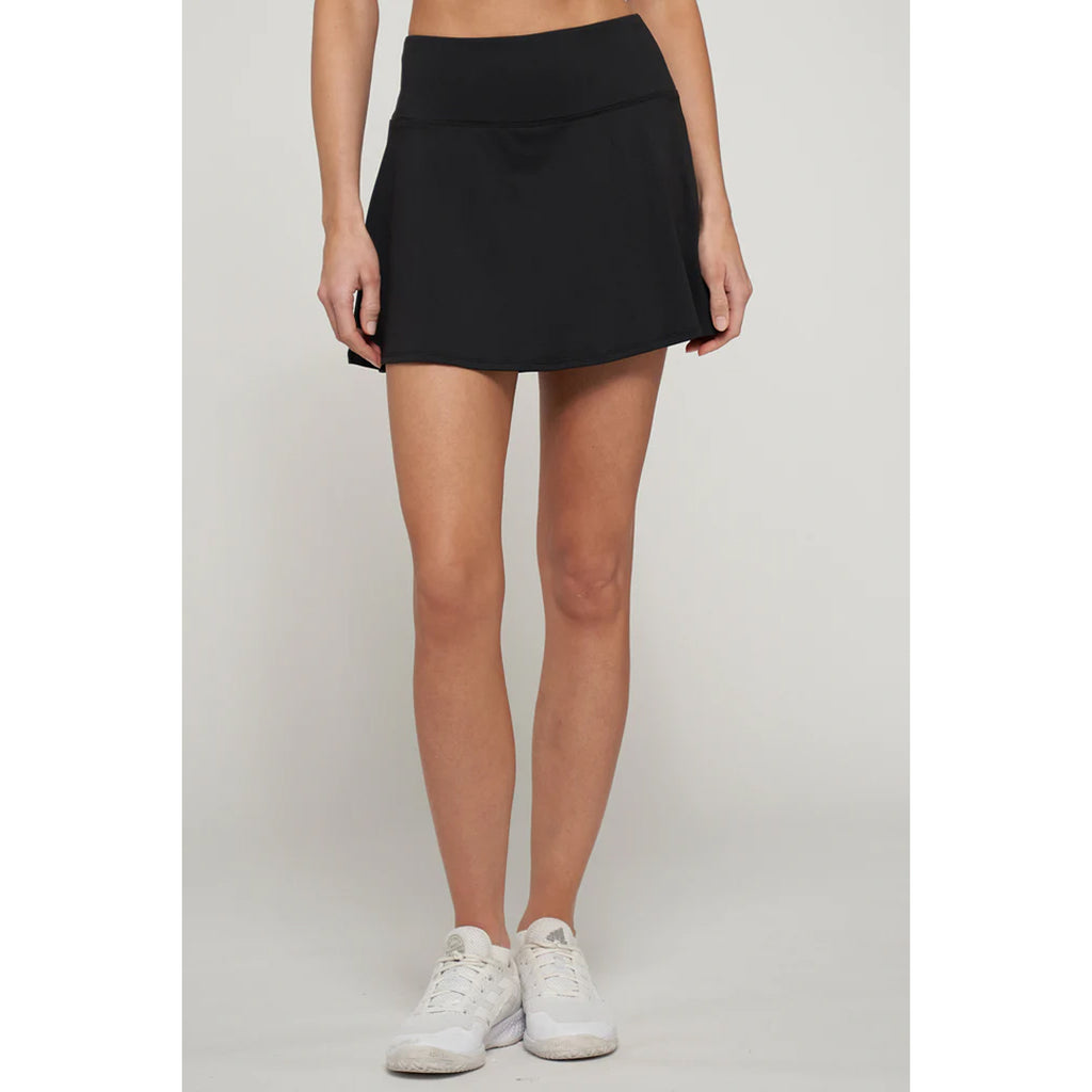 Sleek and flattering skort, in black. The Patina Skort is 14" length skort with a subtle a-line silhouette. There are pockets on the undershorts on each side. The high waistband offers a comfortable and flattering look.