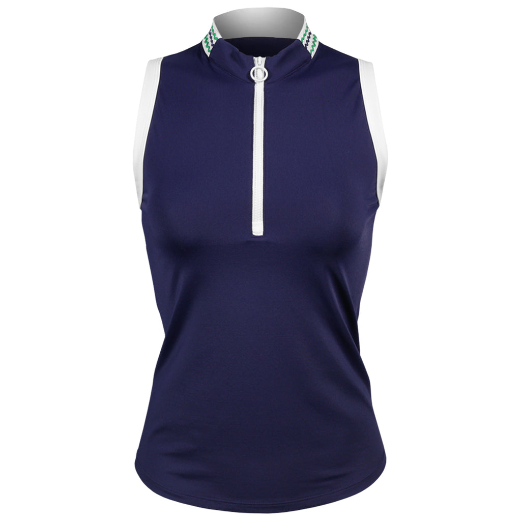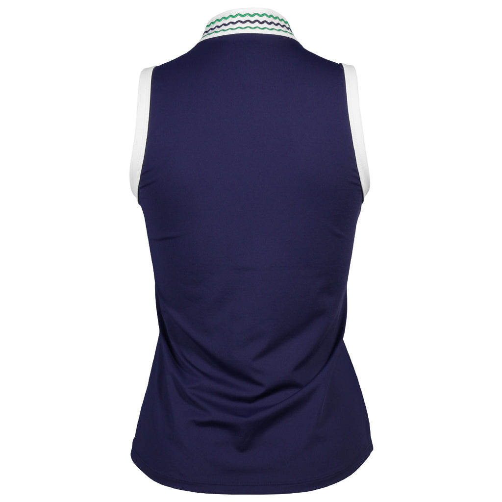 Stylish zip polo with a sporty look in classic navy. Elevate your game with the Wave Trim Zip Front Golf Top, a perfect fusion of athletic performance and refined style. Designed for the modern woman who moves with purpose, this sleeveless top features a soft rib inner collar for added comfort and a sleek zip-front closure that offers adjustable ventilation. The signature Wave Trim detail adds a dynamic touch, symbolizing movement and energy, while the 24" length provides a flattering fit.