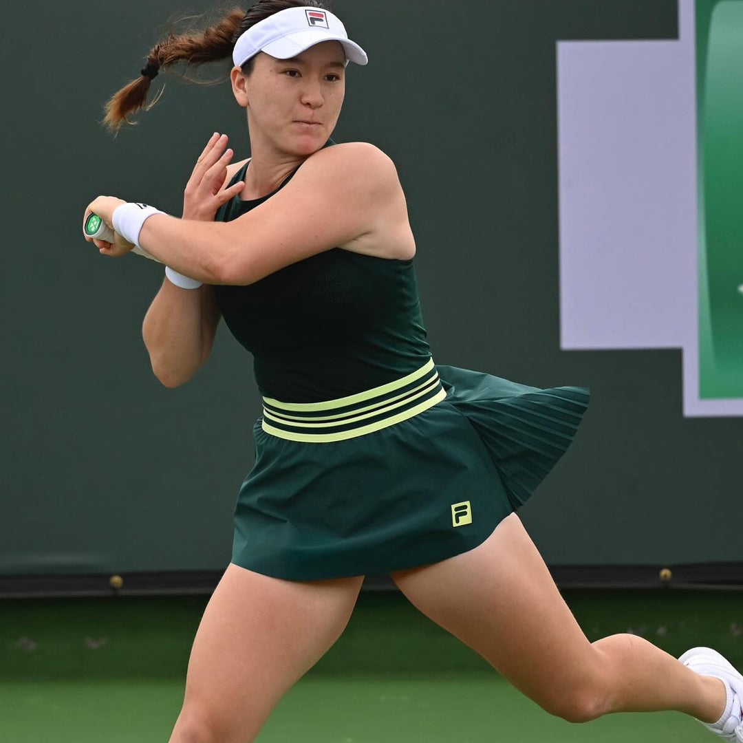 Attractive green tank designed for excelling at tennis. Redefine your on-court style with this innovative seamless tank, designed for peak performance and worn by Fila’s top tennis athletes. The breathable, sweat-wicking knit fabric and horizontal textured detailing provide optimal ventilation to keep you cool and dry, while the seamless construction ensures a comfortable, second-skin fit. The bold contrast F-Box logo and signature heritage stripe detailing on the straps make a statement wherever you go.