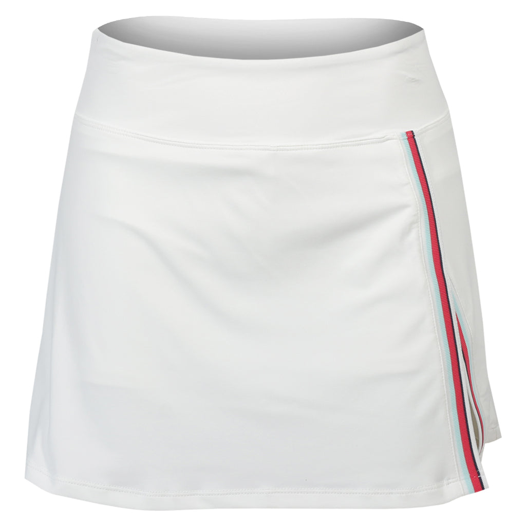 This contemporary and sleek design makes for a stylish skirt in white. This modern A-line skirt combines athletic flair with sleek design. It features an angled seam accented by striped rib detail and a front left leg slit for added movement and style. Laser-cut perforated fabric at the shoulders enhances breathability, while the 13" length and body-skimming fit create a flattering, performance-ready silhouette.