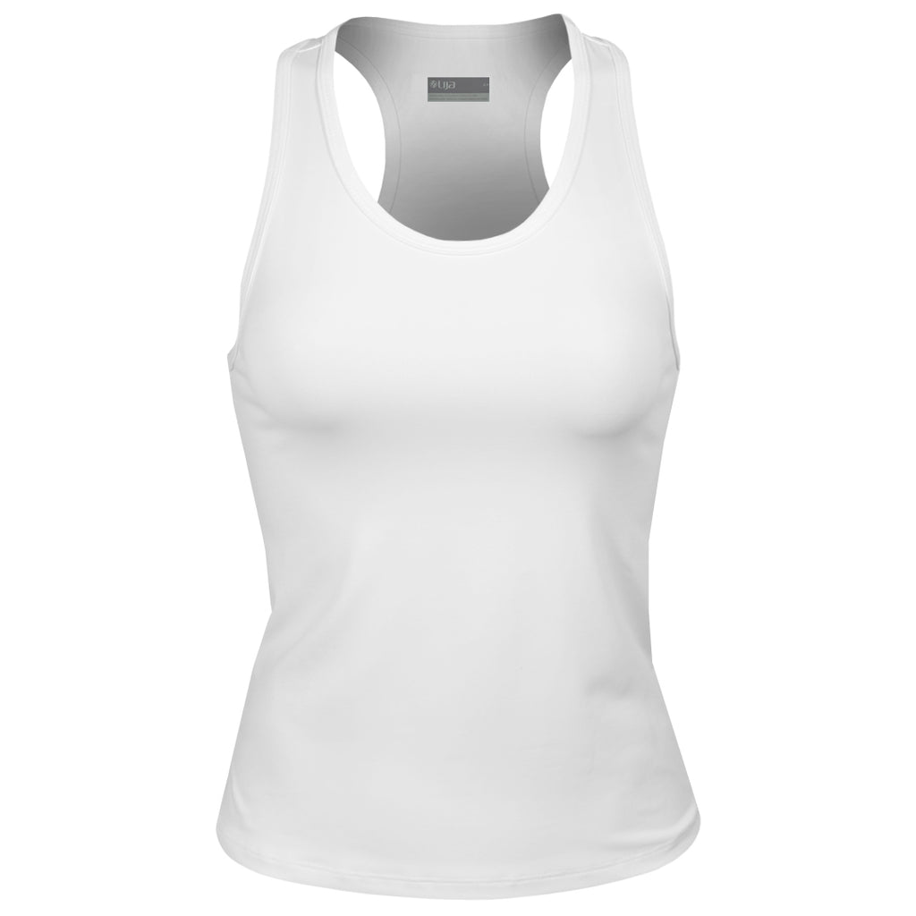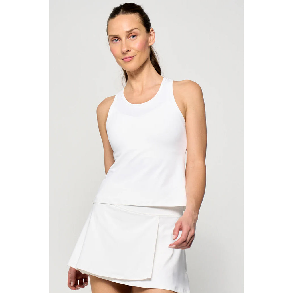 Classic white top, perfect for tennis with added style on the back. This sleek and modern tank features a high scoop neckline and a clean front for a streamlined look. The racerback design includes a subtle peek-a-boo detail at the back, adding a touch of style. With a 20" length and body-skimming fit, it offers a flattering silhouette perfect for layering or wearing on its own.