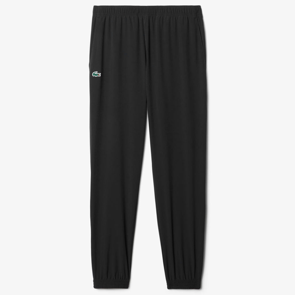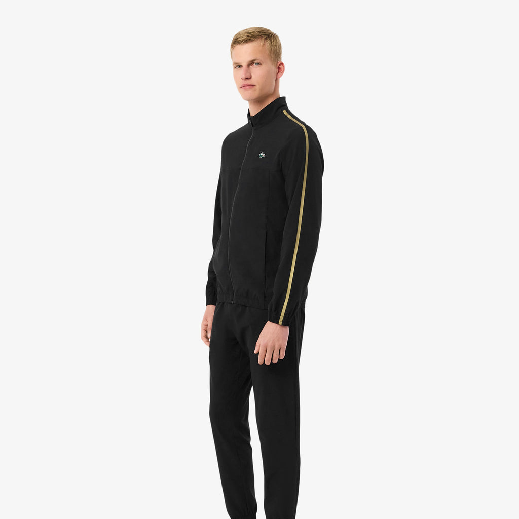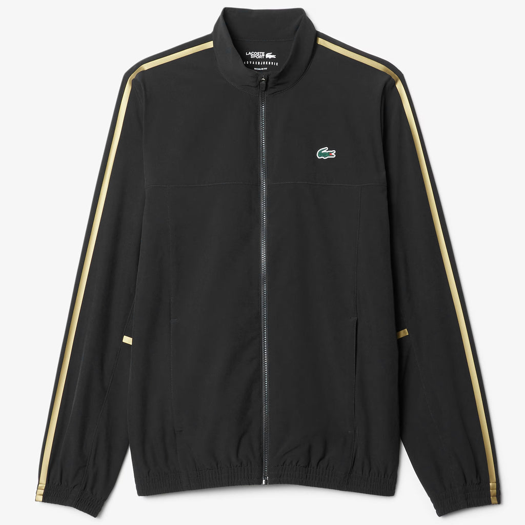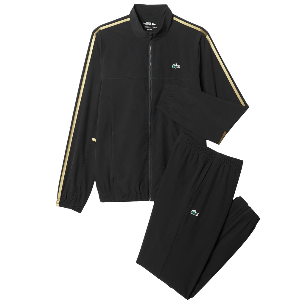 Sleek black and gold sweat suit. This tracksuit, tried and tested by champion player Novak Djokovic, is a testament to 90 years of Lacoste tennis expertise. Made from stretch fabric with Ultra-Dry technology for comfort and freedom of movement. A technical design that blends elegance and performance, with sleek lines and sophisticated contrast stripes.