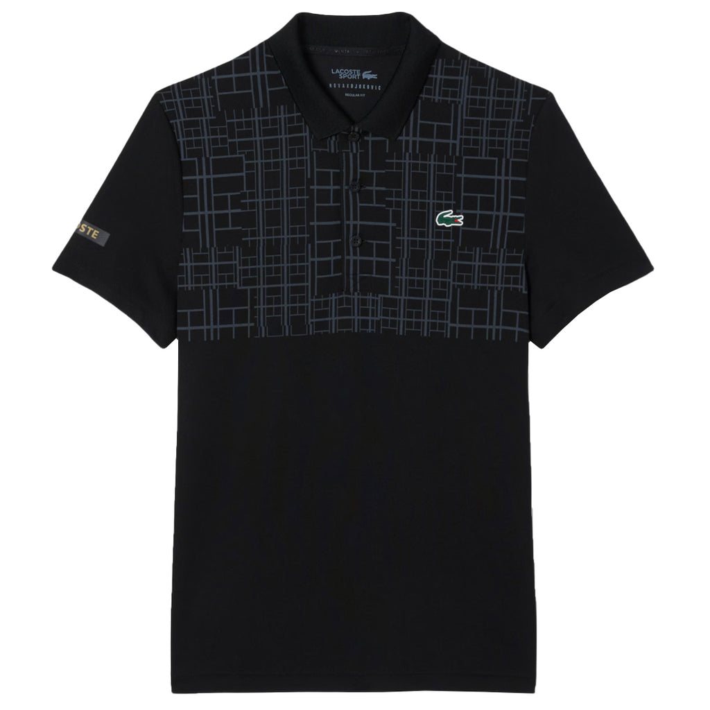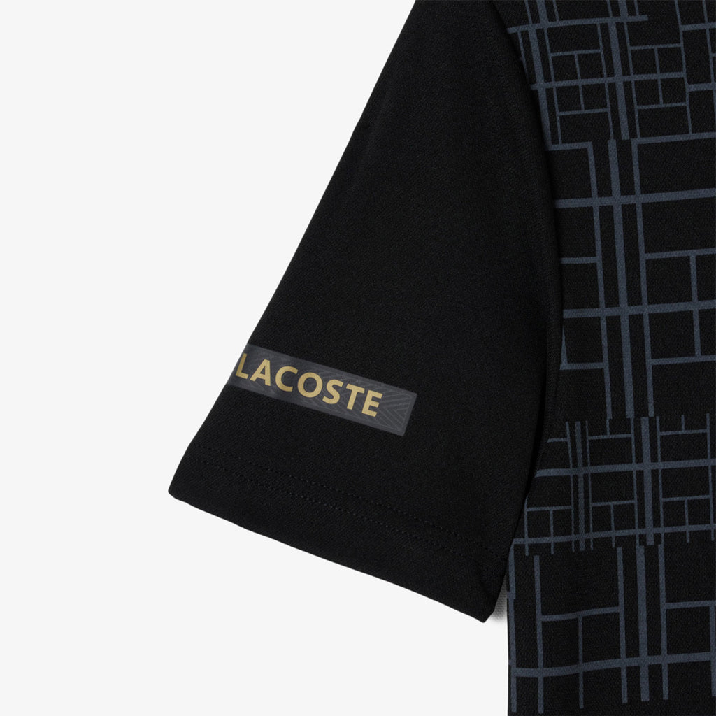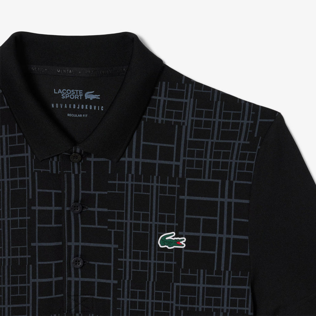 Pure tennis fashion in stylish black. This polo shirt, tried and tested by sporting superstar Novak Djokovic, is a lesson in Lacoste tennis expertise. Made from our iconic piqué knit fabric, with Ultra-Dry technology to keep you feeling fresh. The large central print, inspired by tennis racket forms, adds a bold, graphic touch.