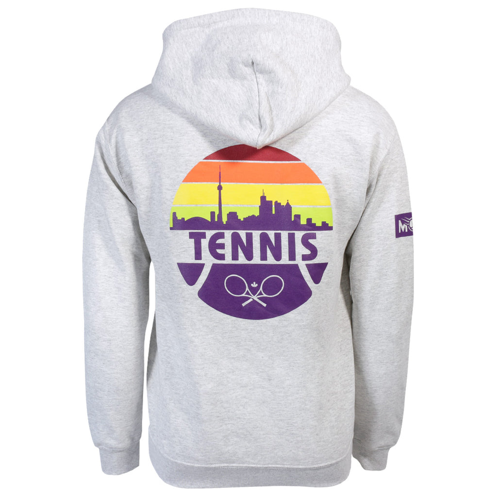 Grey hoodie with Merchant of Tennis branding. This classic-fit hoodie features a double-lined hood with a color-matched drawcord for a clean, coordinated look. A spacious pouch pocket adds convenience, while the 1x1 rib with spandex ensures enhanced stretch and shape recovery. The seamless body offers a comfortable fit, and the garment is finished with a high-performing black recycled tear-away label for easy removal.