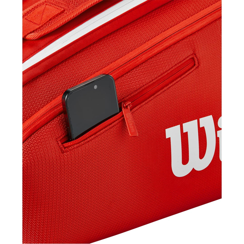 The ultimate bag for the domineering player. Enjoy impeccable quality and professional-grade utility with Wilson’s latest Super Tour bag collection, in the brand’s iconic red color. Designed to hold up to 9 racquets, clothing and accessories, this bag features two main compartments, one with a Thermoguard lining to protect contents from extreme temperatures. Two large pockets and one small exterior pocket store smaller items like a wallet, phone and other valuables. The versatile carrying system includes adjustable, padded shoulder straps for backpack use and a sturdy carry handle for easy carrying and comfort.