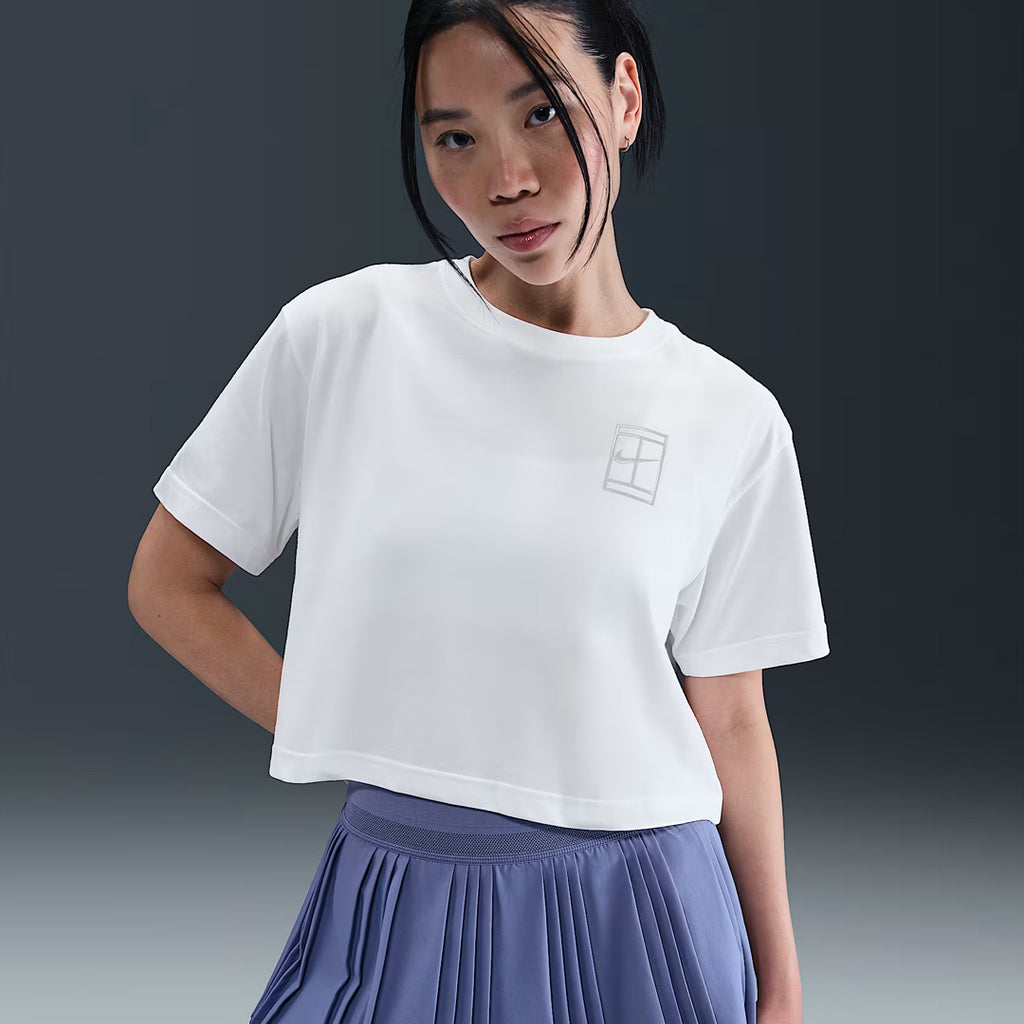 Fun, cropped and full of style. Hit the tennis court in this roomy graphic tee. Its soft cotton blend fabric has Nike Dri-FIT tech that moves sweat away from your skin for quicker evaporation, helping you stay dry and comfortable.