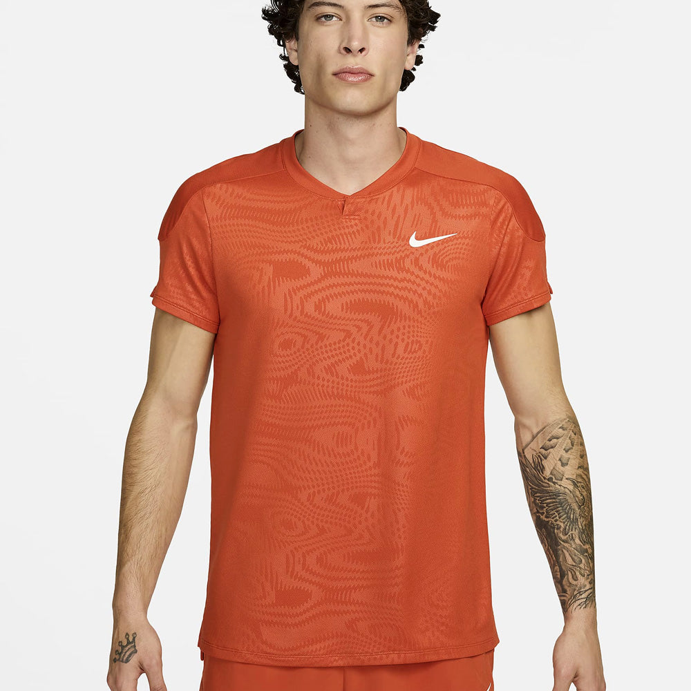 Unique rust colour to prepare you for the biggest clay tournament of the year. The NikeCourt Slam Men's Dri-FIT Tennis Top Nike built the slim-fit Slam tennis top using insights from their athletes to optimize your on-court performance. They're built to let you move effortlessly from baseline to net with a relaxed fit and lightweight, stretchy fabric. An innovative sleeve design helps arms move free and easy during each rally. Add a French-inspired moire print to celebrate the biggest clay tournament every year, and you'll be racquet ready anytime.