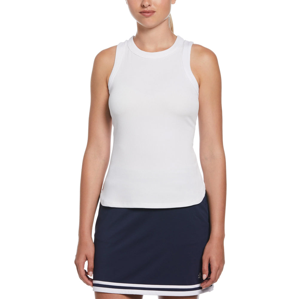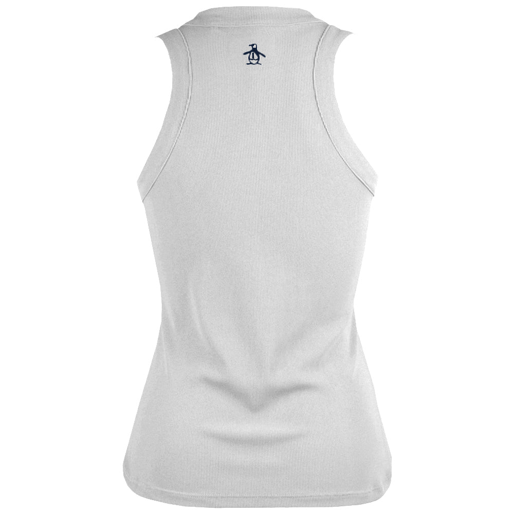 Classic white Penguin styled shirt, great for tennis. This Original Penguin women's tennis tank top is made from lightweight single knit fabric that offers stretch for ease of movement on the court. Moisture-wicking technology helps to keep you dry, while the tennis top's sleeveless, lightly ribbed design offers a sleek, fashionable look. The versatile solid-colored tank top is ideal for tennis enthusiasts seeking a combination of style and functionality in their sportswear. A Pete logo at the back adds a fun finishing touch to the design.