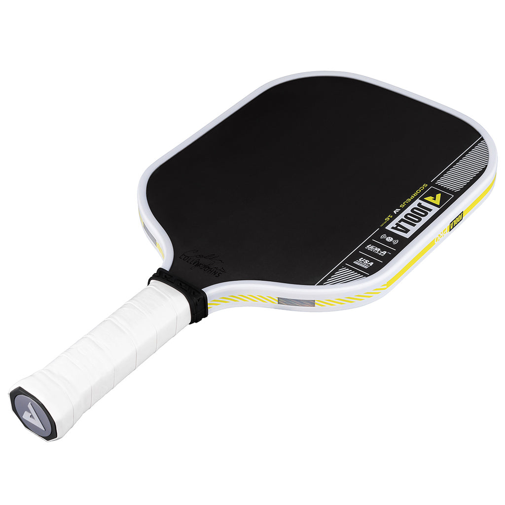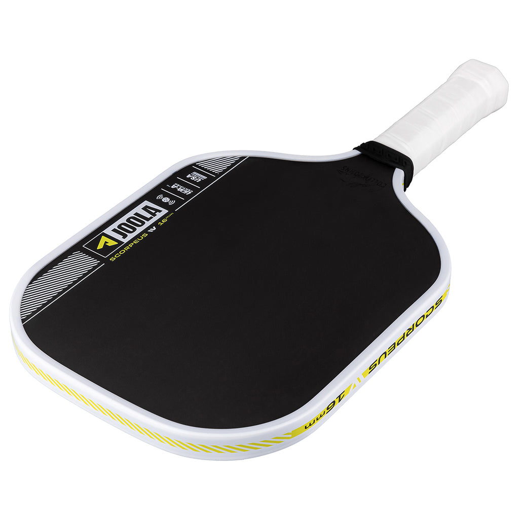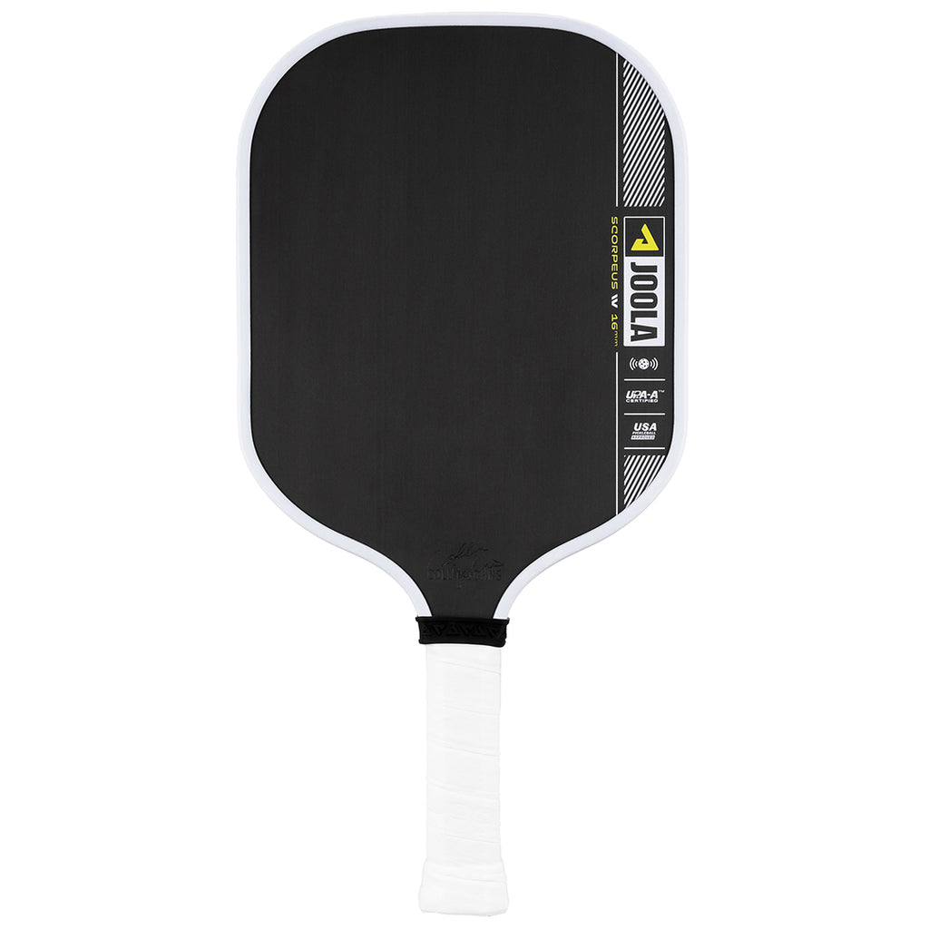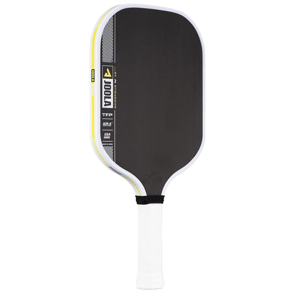 Smash and sting the opponent in 16mm width. The Scorpeus Pro IV 16mm pickleball paddle, powered by TechFlex Power (TFP) technology, delivers a new standard in balance and responsiveness. By maximizing paddle width over length, the Scorpeus Pro IV shape becomes easier to maneuver, allowing your instincts to take over during fast-paced hand battles. Advanced weight distribution throughout the paddle helps reduce fatigue and offers real-time feedback to let you adapt to the flow of the game. Building on the power and feel of JOOLA's innovative Propulsion Core, this paddle redefines consistency and performance every time you take to the court. All Pro IV paddles are USAP PBCoR 43 certified and UPA-A pro certified.