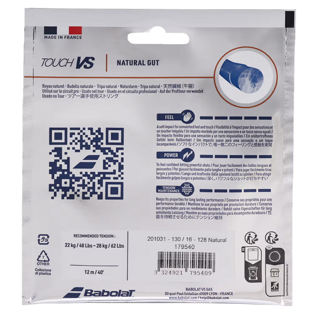 Babolat VS Touch, the original string and still the best. First produced in 1875, VS Touch has come a long way with the addition of BT7 layering and Thermogut technologies it has become more durable and more able to stand up to adverse weather conditions. It is the softest, most powerful string with the best tension maintenance. Used by over 30% of players at Grand Slam events as part of hybrids but is perfect for players of any ability, especially anyone suffering with with injury issues.