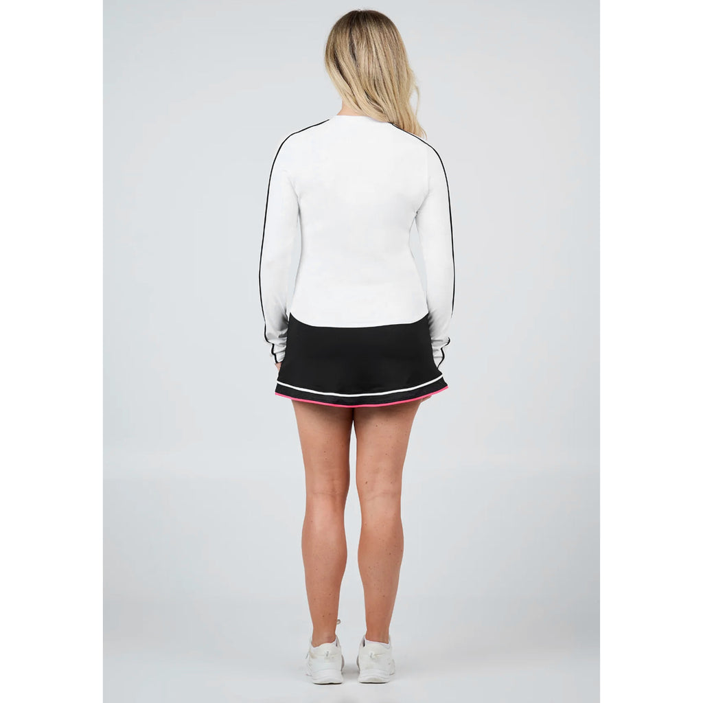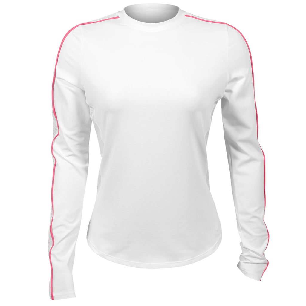 Sleek and sporty design in white. Engineered for performance with a modern edge, this women’s tennis long sleeve top features strategically placed mesh inserts for enhanced breathability and airflow. The streamlined silhouette and lightweight stretch fabric ensure full range of motion, while moisture-wicking technology keeps you cool and comfortable through every match. Sleek and functional, it’s the perfect layer for high-intensity play or warm-up sessions.