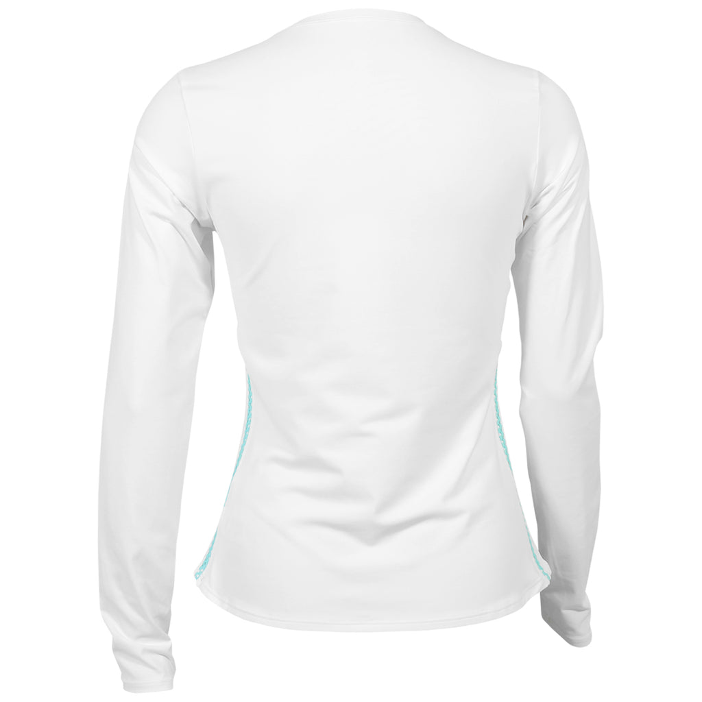 Elegant long sleeve in white with blue accents. Stay cool and focused in the Perfect Storm Long Sleeve Crew Neck Top, designed for elevated performance with a clean, minimalist aesthetic. Crafted in crisp white, this long sleeve top is accented with Magic Mesh inserts along the sides for enhanced breathability and airflow during high-intensity play. A dual Trellis Trim detail—one in True Blue and one in Blue Light—frames the mesh panels on both sides, adding subtle structure and a refined color contrast that reflects the Perfect Storm collection’s signature palette. With a classic crew neckline, slim athletic fit, and lightweight feel, this top is perfect for layering or wearing solo.