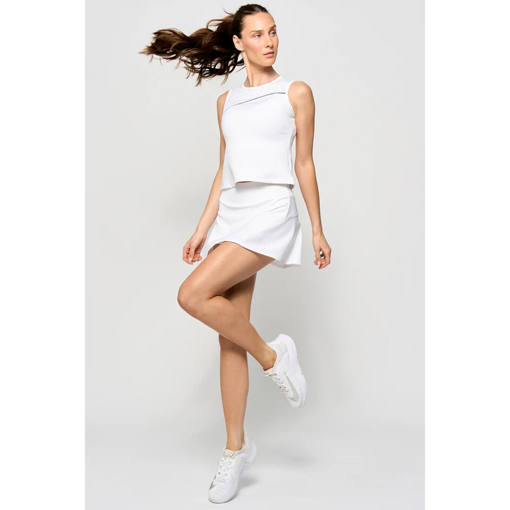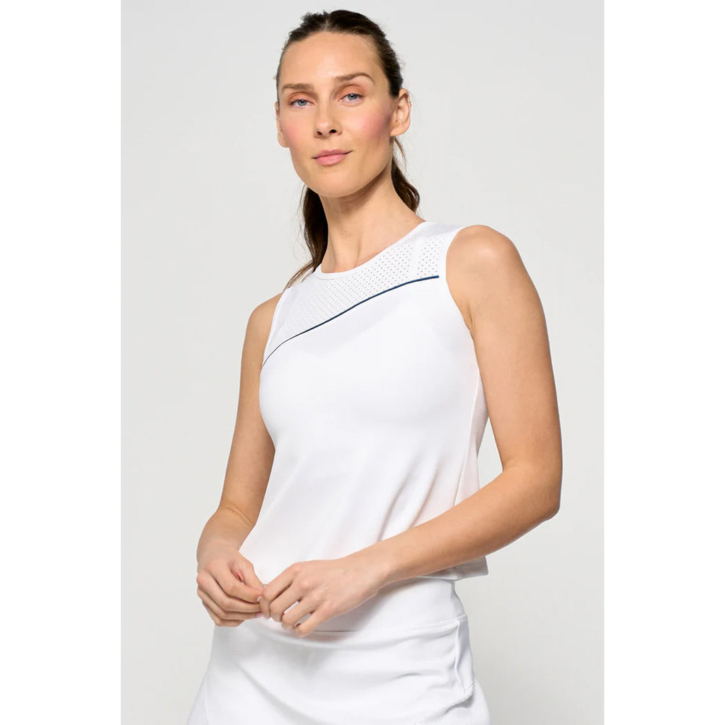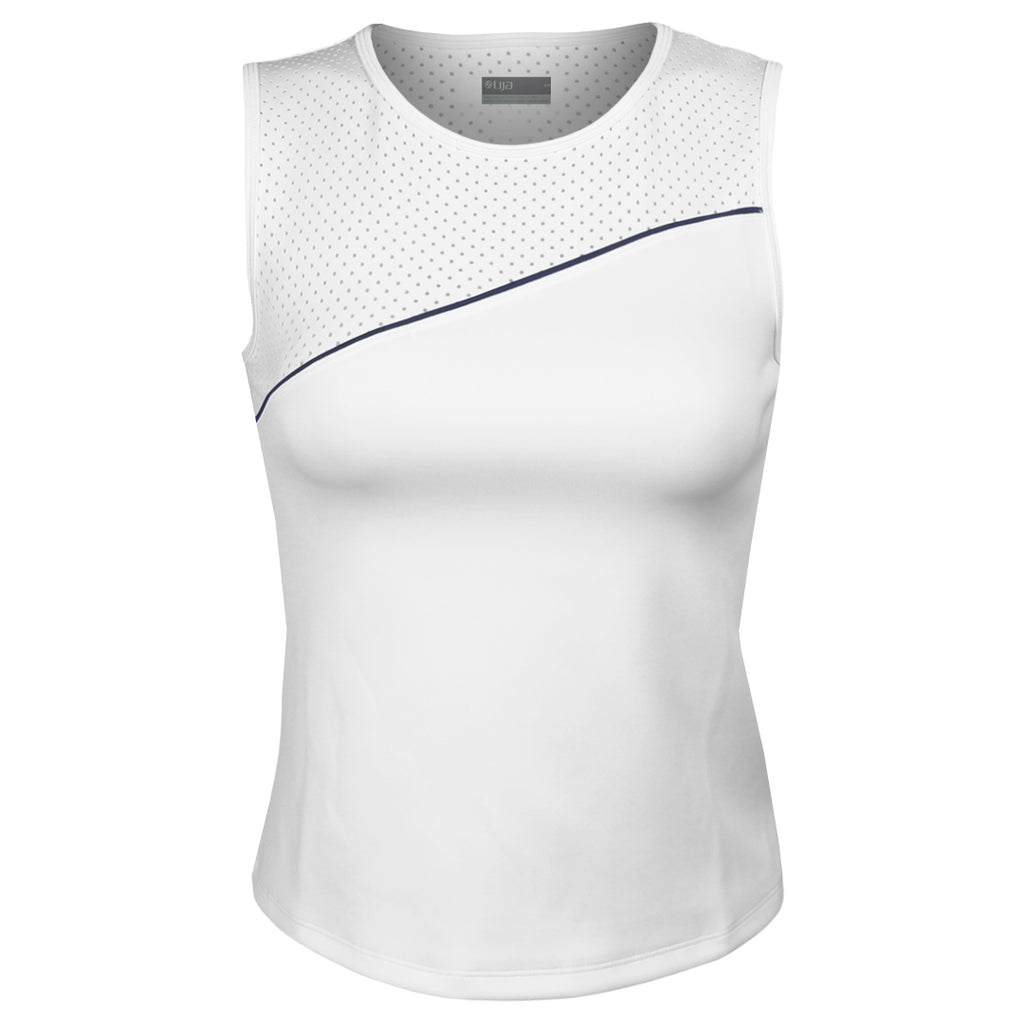 Jersey style with breathable mesh in white and marine. This modern performance top features a classic crew neckline and an asymmetrical seam with contrast piping across the upper bust and back for a dynamic look. The upper body is crafted from laser-cut perforated fabric to enhance breathability. With a 20" length and body-skimming fit, it offers a flattering silhouette designed for both movement and style.