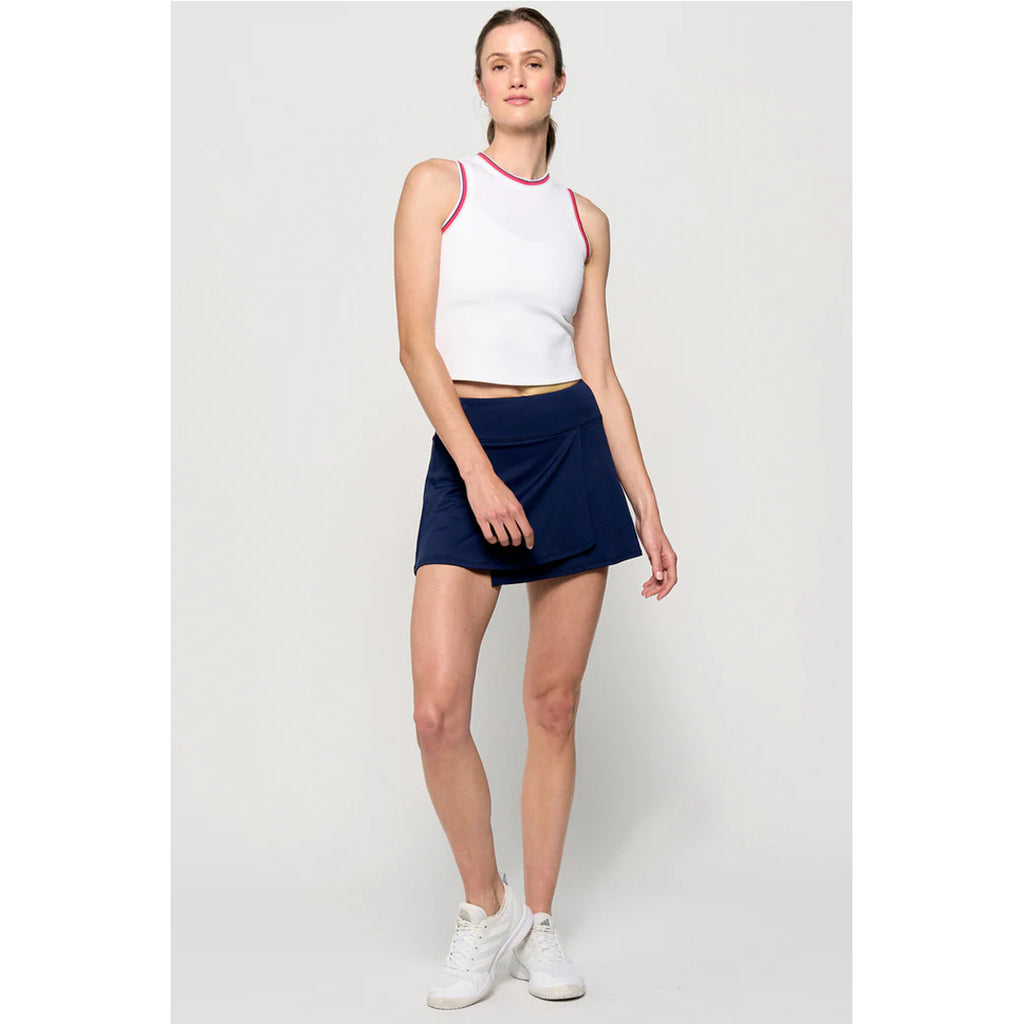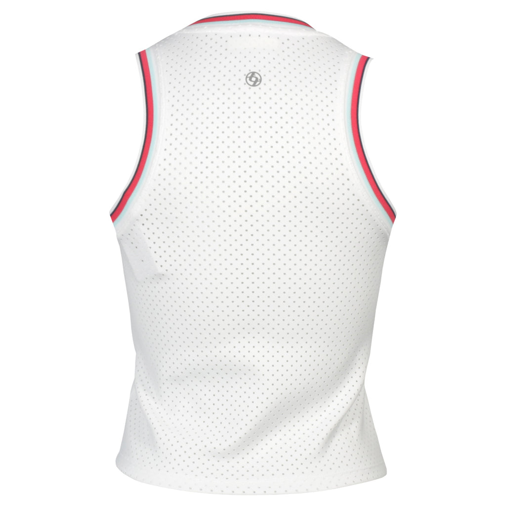 Classic sport style in cute crop length with a mix of white and other fun colours. This cropped tank top combines sporty details with breathable performance. Striped ribbing at the armholes and neckline adds a bold, athletic touch, while the full back panel features laser-cut perforated fabric for enhanced ventilation. With a 19" length and a fitted silhouette, it's designed for comfort and style in motion.