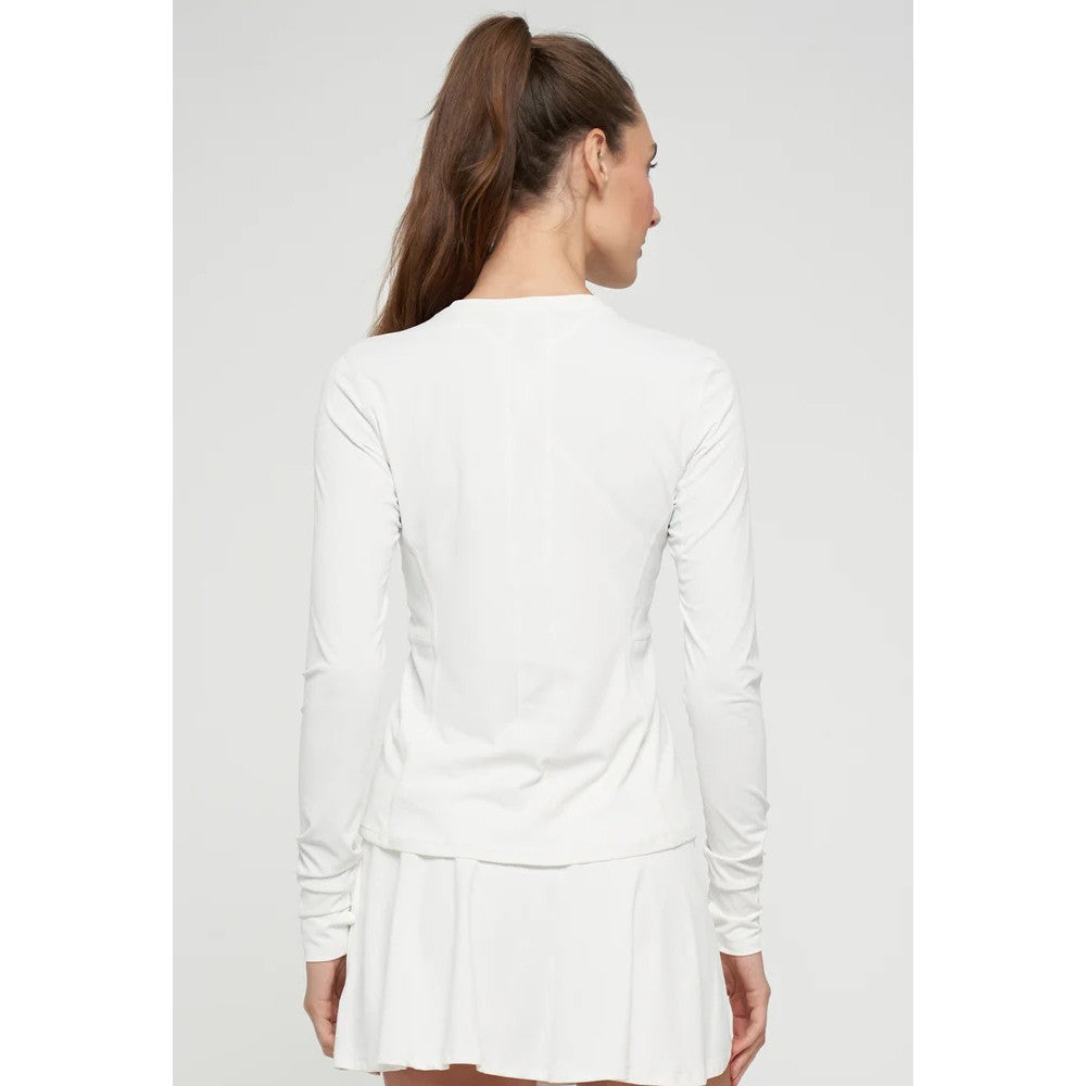 In stylish white, this top has a simple yet modern design. It features a classic crew neckline and inset shoulder seams for a clean look. The fitted long sleeves have thumb holes for extra comfort. A curved seam under the bust line and princess seams at the front and back create a flattering shape. Tonal mesh under the armholes adds breathability, while a 1-inch vertical inset panel down the center back adds a subtle detail. With a slightly curved hemline and a 22.5-inch length, this fitted top is both stylish and comfortable. Solar material with UPF 50+ sun protection.
