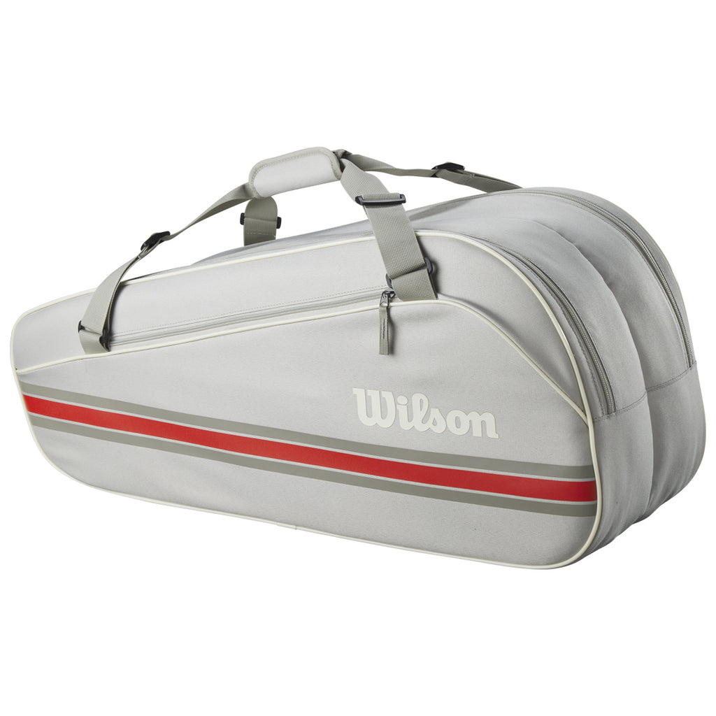 Carry the essentials to court. A great bag for club players looking to carry extra gear, the latest Team 6-Pack from Wilson provides room for up to six tennis racquets, apparel and other tennis essentials. In addition to the two main racquet compartments, there's a large outer zip pocket for stashing extra balls, grips and personal items. It's made from durable polyester with a top grab handle and adjustable shoulder straps for comfortable carrying.