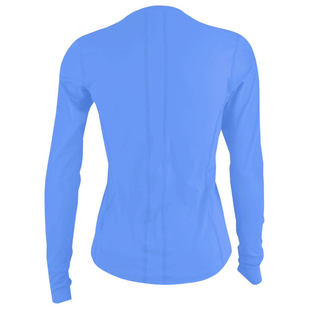 With an elegant light blue colour, this top has a simple yet modern design. It features a classic crew neckline and inset shoulder seams for a clean look. The fitted long sleeves have thumb holes for extra comfort. A curved seam under the bust line and princess seams at the front and back create a flattering shape. Tonal mesh under the armholes adds breathability, while a 1-inch vertical inset panel down the center back adds a subtle detail. With a slightly curved hemline and a 22.5-inch length, this fitted top is both stylish and comfortable. Made with Lija's solar material making this longsleeve have UPF 50+.