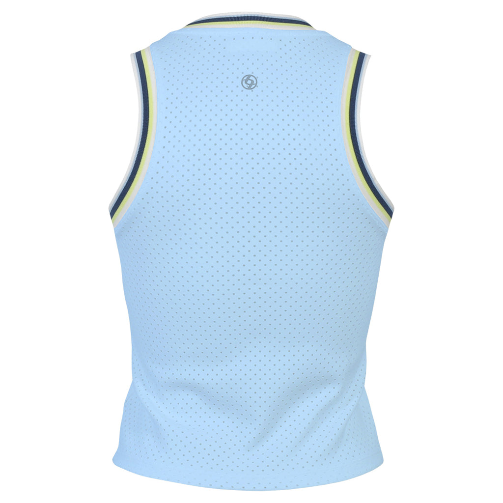 Stylish, breathable tank, great for sports is lovely cool blue. This cropped tank top features striped rib detailing on the armholes and neckline for a sporty edge. The full back panel is made from laser-cut perforated fabric for maximum breathability, while the 19" length and fitted silhouette create a sleek, modern look.