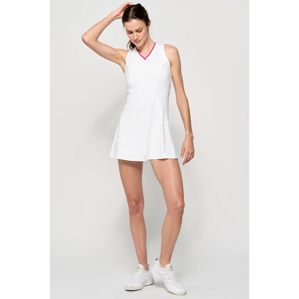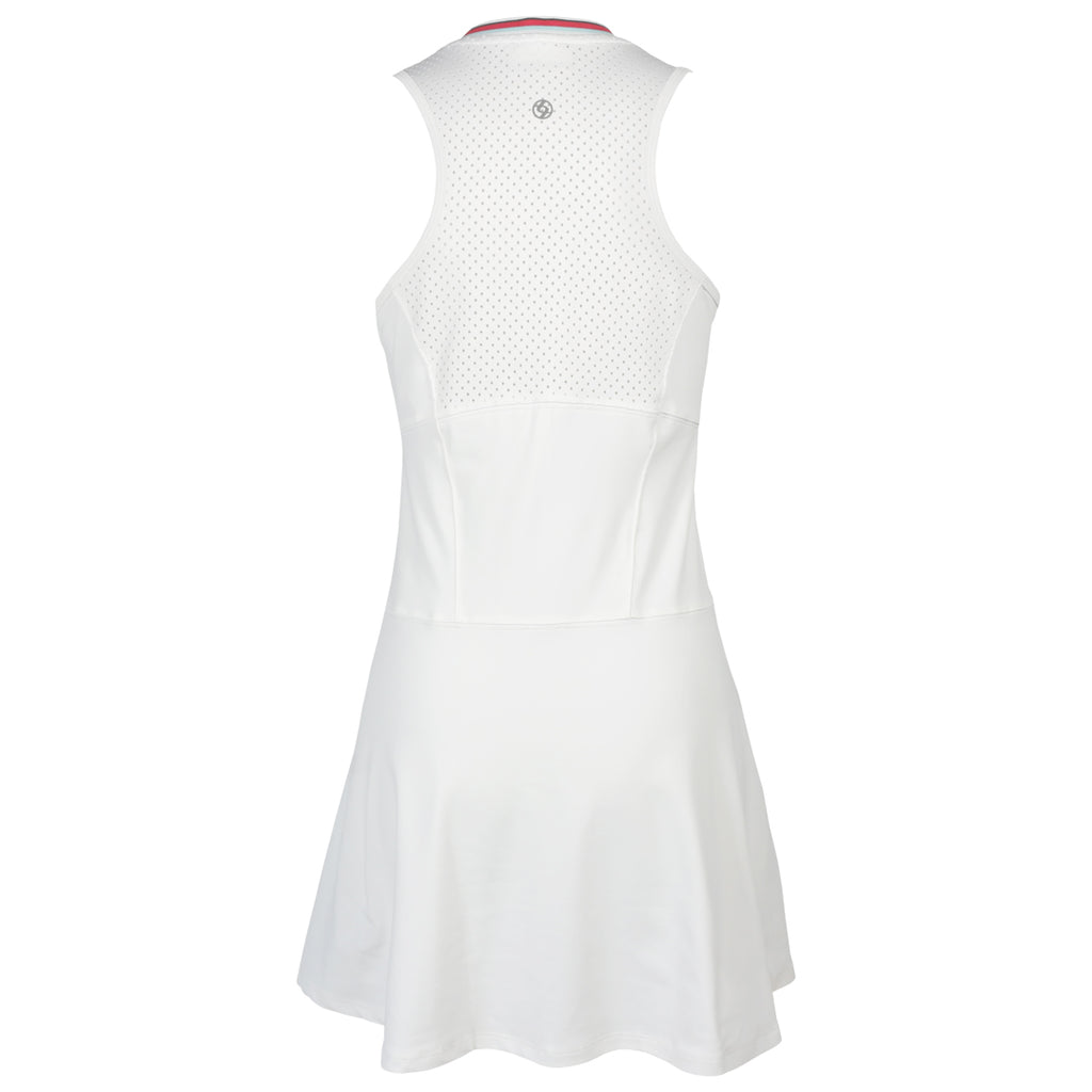 Great tennis dress for style on court. This stylish dress blends sporty accents with feminine design. It features a V-neckline with striped rib detail and princess seams at the front and back for a flattering shape. A defined waist seam and asymmetrical front skirt seam add modern structure, while extra flutter at the back brings movement and charm. The upper back is made from laser-cut perforated fabric for breathability. With a 32" length and body-skimming fit, it’s designed for both comfort and performance.