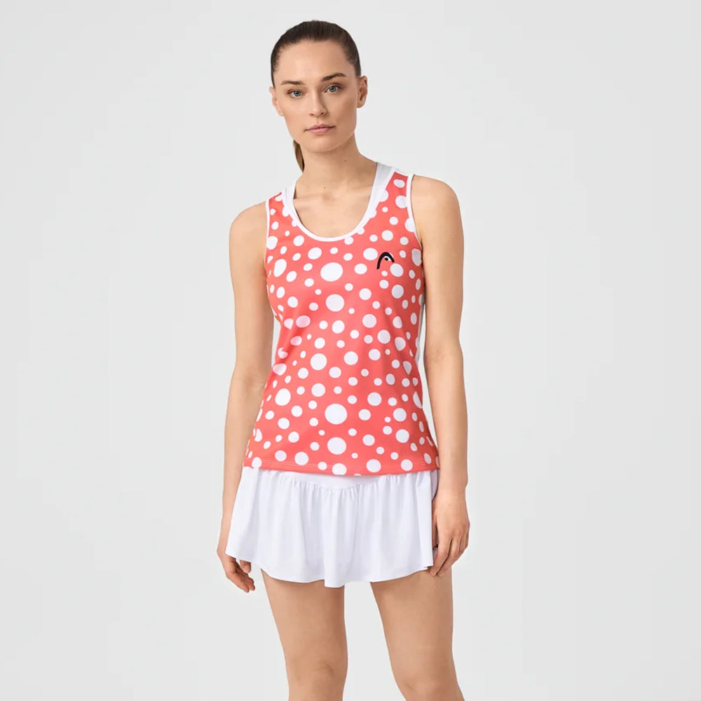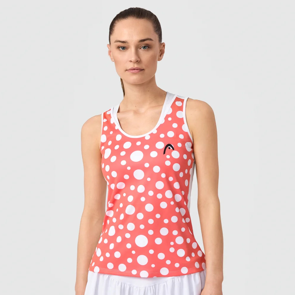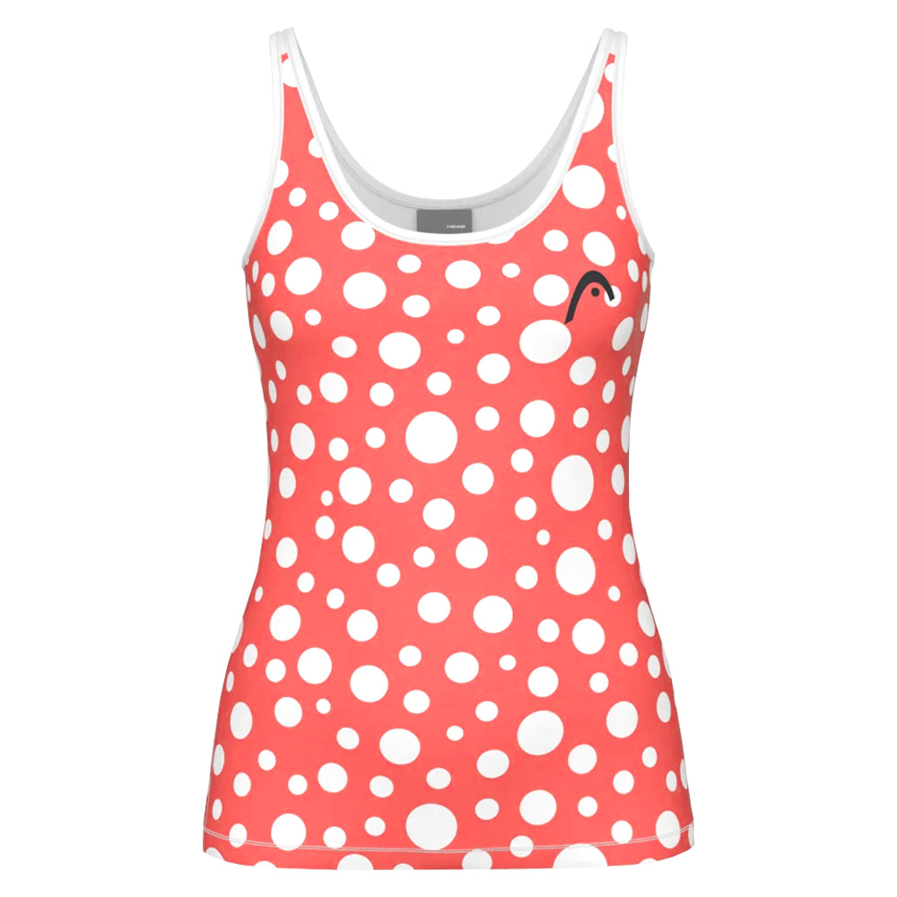 Fun, lightweight style that will stand out on court. Express your style in the women’s SPIRIT II TANK TOP, which combines a sporty, feminine and dynamic look with advanced cooling technology that will keep you feeling fresh. Fashioned from 100% polyester interlock, this tank top has a round feminine neckline and a very tight fit and is sublimated on the front side. The HEAD branding and the iconic wishbone logo add to the sporty look of the SPIRIT II TANK TOP, which includes vibrant dot designs. The high-performing Moisture Transfer Microfiber technology brings a cooling effect and helps the fabric to dry quickly.