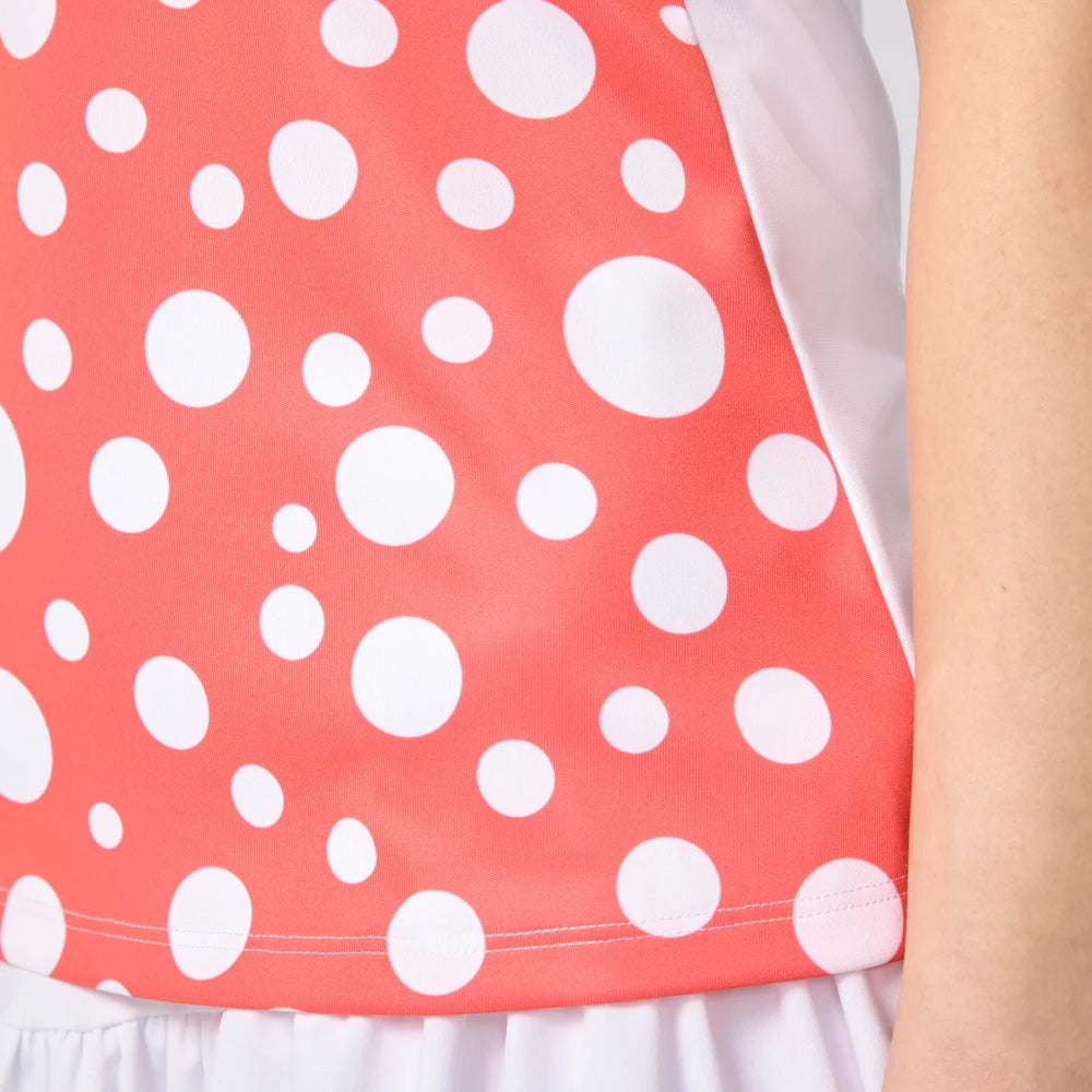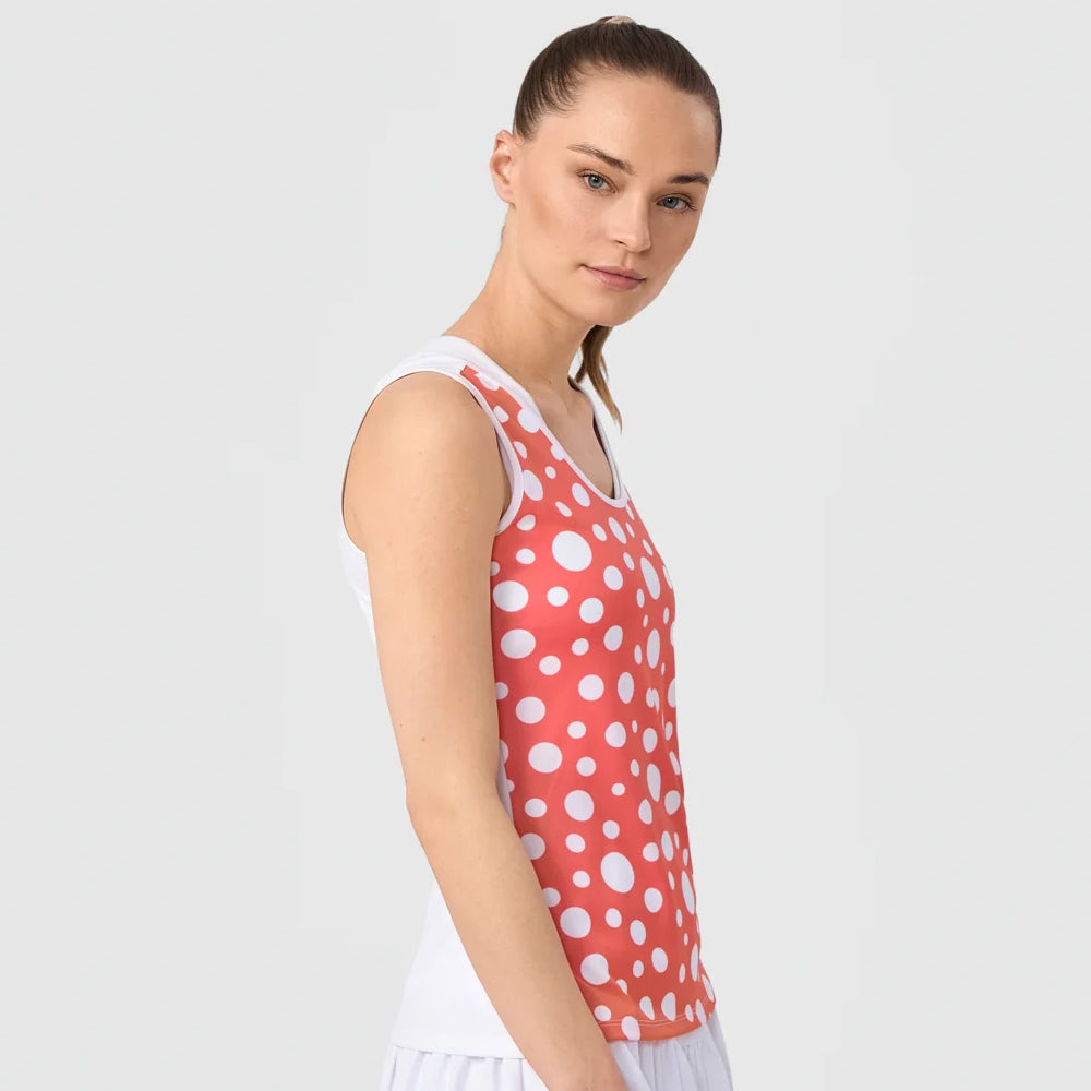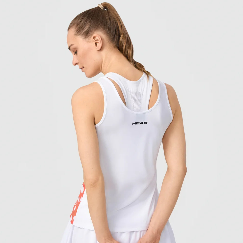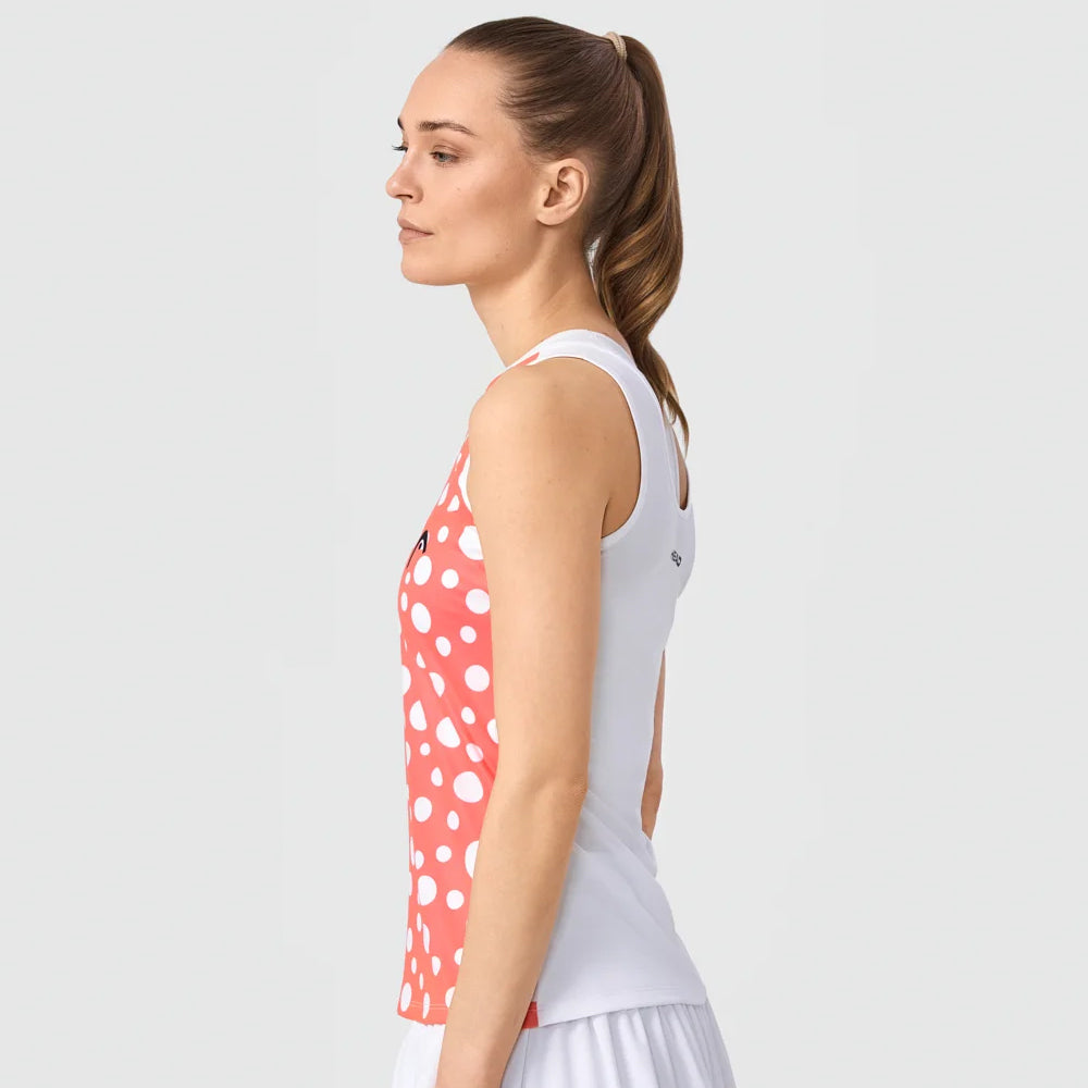 Fun, lightweight style that will stand out on court. Express your style in the women’s SPIRIT II TANK TOP, which combines a sporty, feminine and dynamic look with advanced cooling technology that will keep you feeling fresh. Fashioned from 100% polyester interlock, this tank top has a round feminine neckline and a very tight fit and is sublimated on the front side. The HEAD branding and the iconic wishbone logo add to the sporty look of the SPIRIT II TANK TOP, which includes vibrant dot designs. The high-performing Moisture Transfer Microfiber technology brings a cooling effect and helps the fabric to dry quickly.
