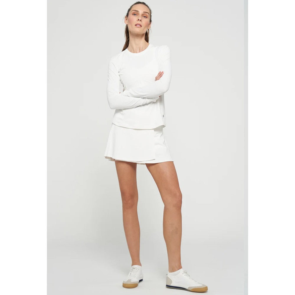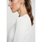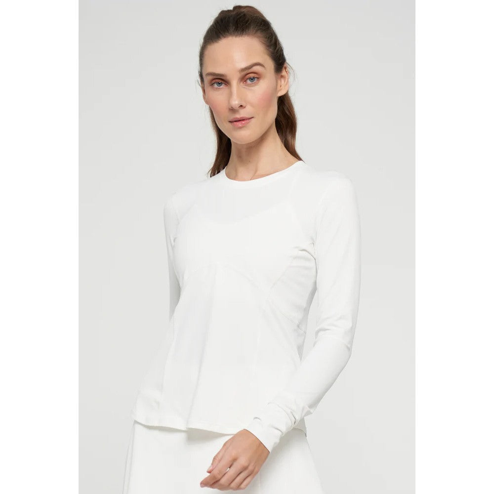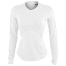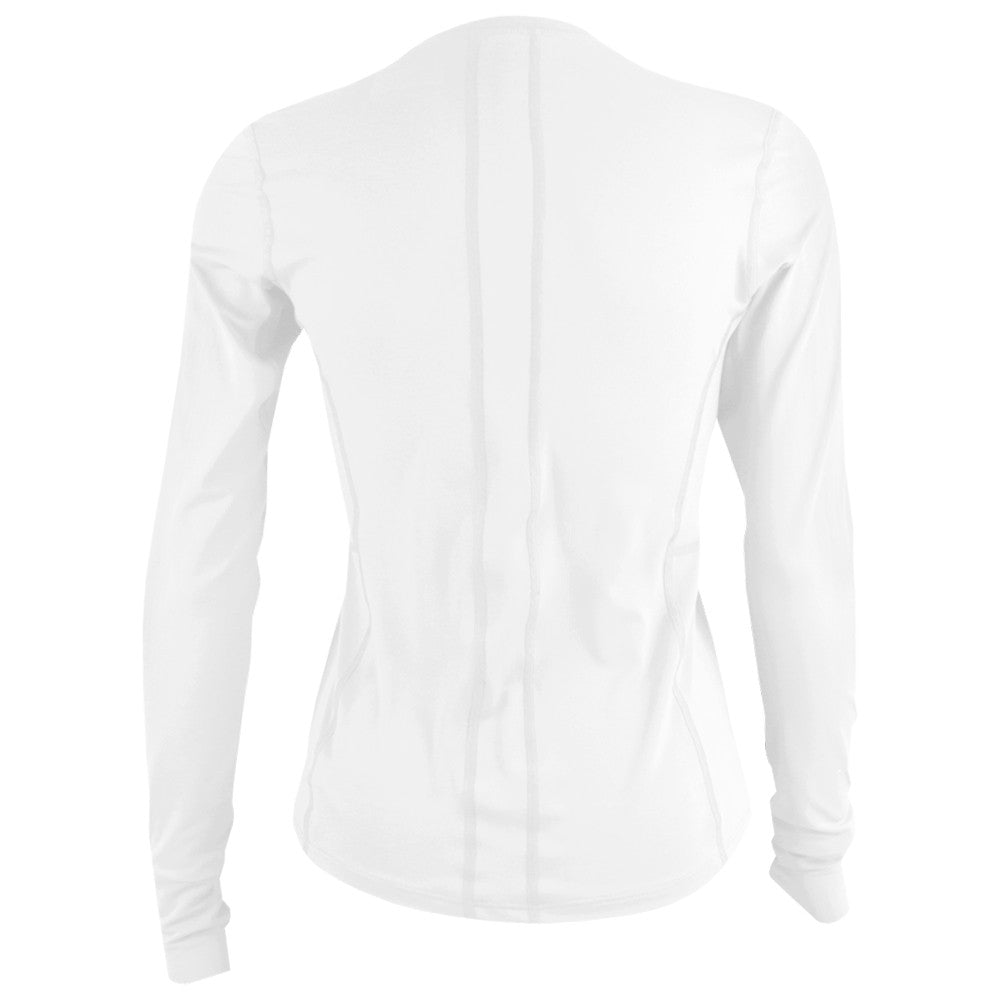 In stylish white, this top has a simple yet modern design. It features a classic crew neckline and inset shoulder seams for a clean look. The fitted long sleeves have thumb holes for extra comfort. A curved seam under the bust line and princess seams at the front and back create a flattering shape. Tonal mesh under the armholes adds breathability, while a 1-inch vertical inset panel down the center back adds a subtle detail. With a slightly curved hemline and a 22.5-inch length, this fitted top is both stylish and comfortable. Solar material with UPF 50+ sun protection.