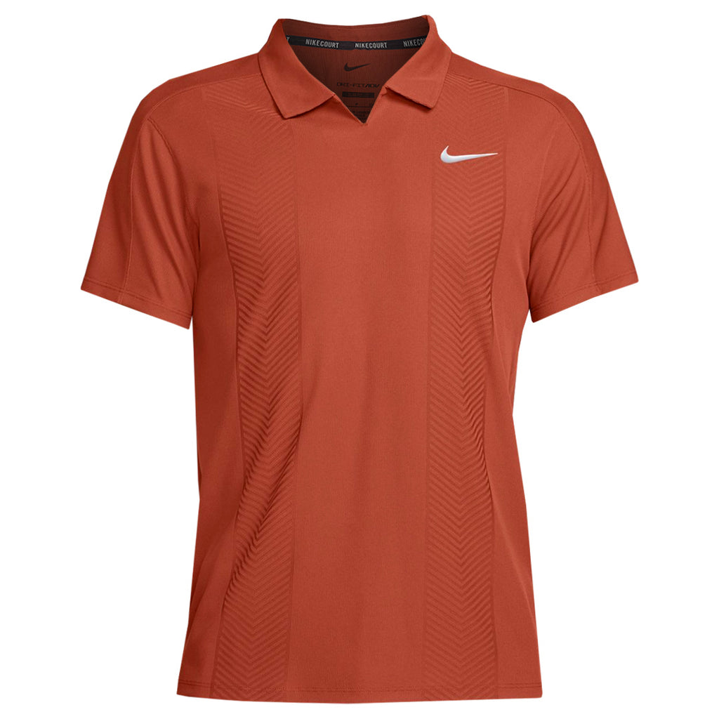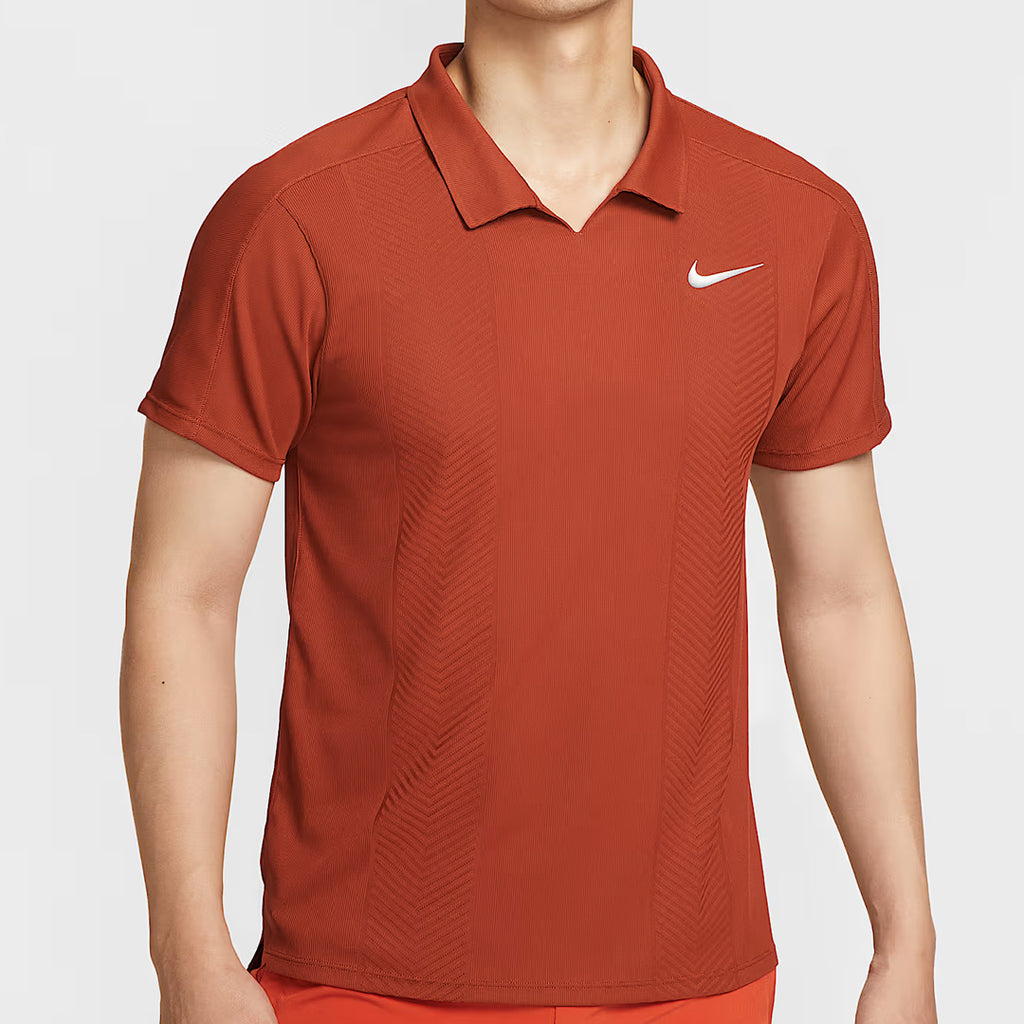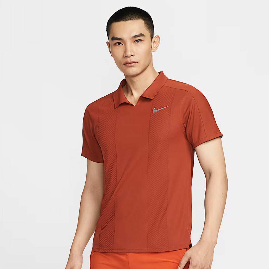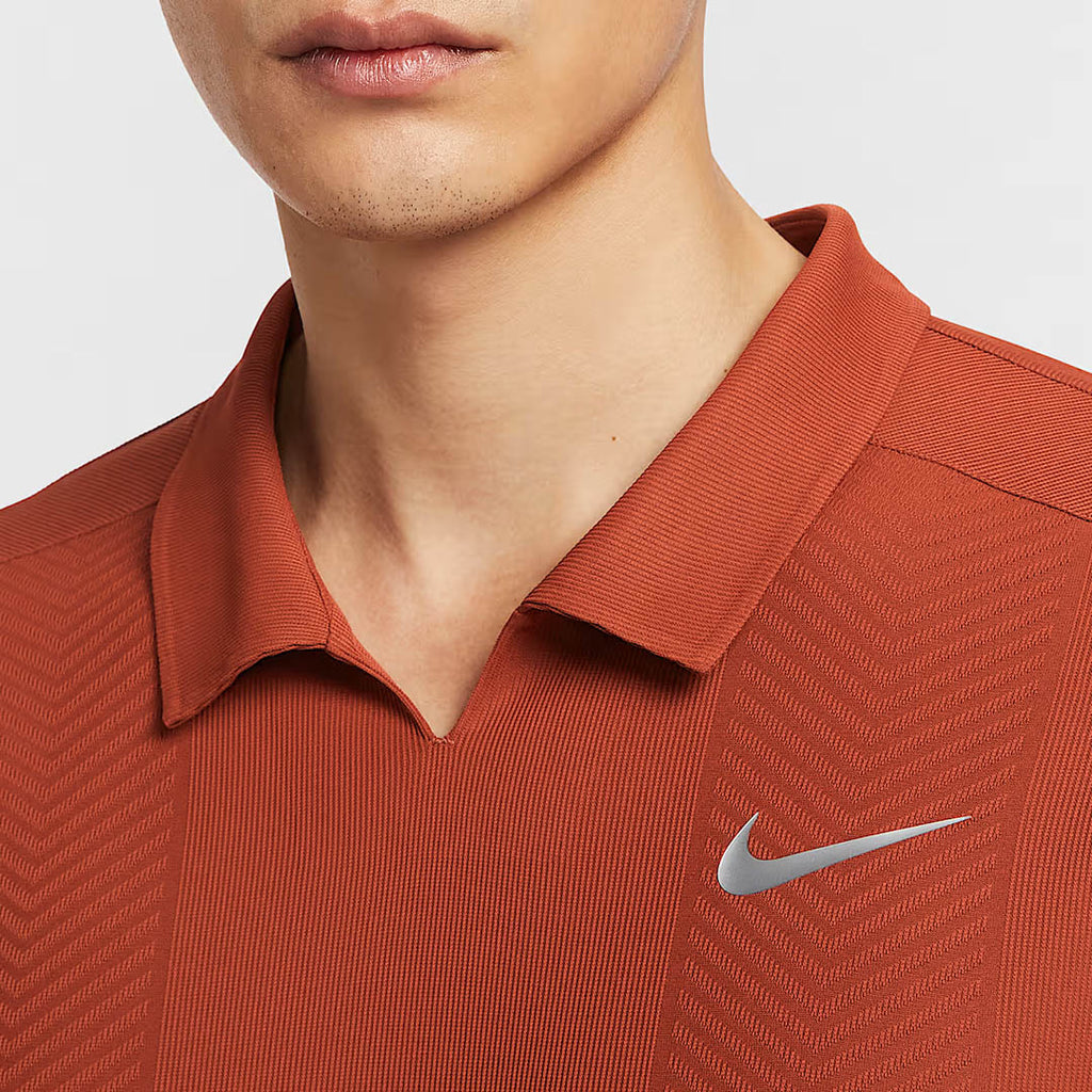 Sophistication on court in Rugged Orange. This polo's simplified buttonless collar and strategically placed shoulder seams help you swing freely. As the intensity rises, advanced sweat-wicking technology helps you stay cool in the moment.