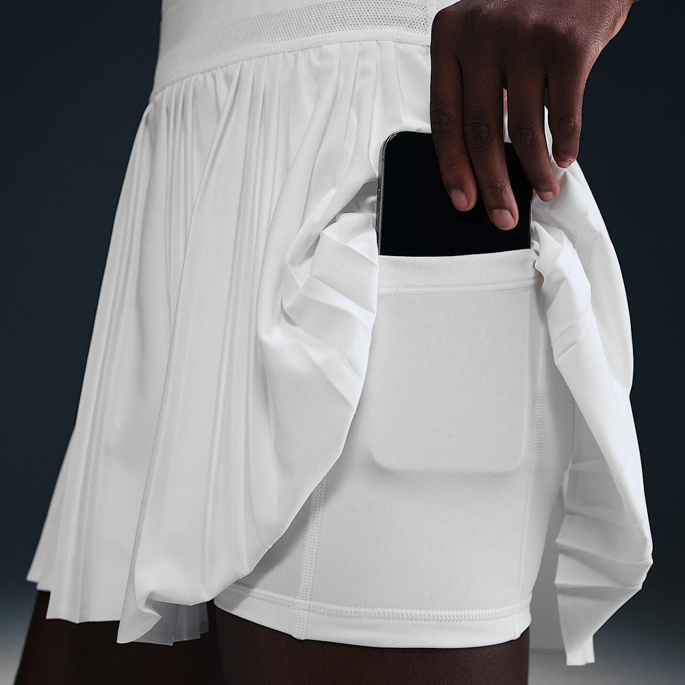 Classic lovely style on court in white. This timeless skirt is made from lightweight woven fabric for cool comfort on the court. Stretchy, built-in shorts give you secure coverage while pockets on both legs offer easy access to your essentials. Nike Dri-FIT technology moves sweat away from your skin for quicker evaporation, helping you stay dry and comfortable.