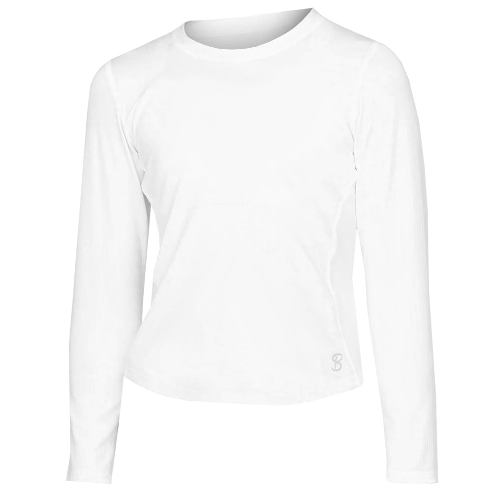 Introducing Sofibella Girl's UV Girls New Long Sleeve in vibrant white. Sofibella’s newest addition to their girl's tennis attire, their UV protected girls' long sleeve tennis top gives you lightweight and breathable coverage. Crafted with Sofibella’s signature soft and stretchy “Sofi-Premier” fabric that offers UV protection, is wicking, quick drying, anti-bacterial, and pilling resistant. Wear this basic girls' long sleeve tennis top for all your athletic needs, golf, pickleball, dance, you name it. Features waffle material.