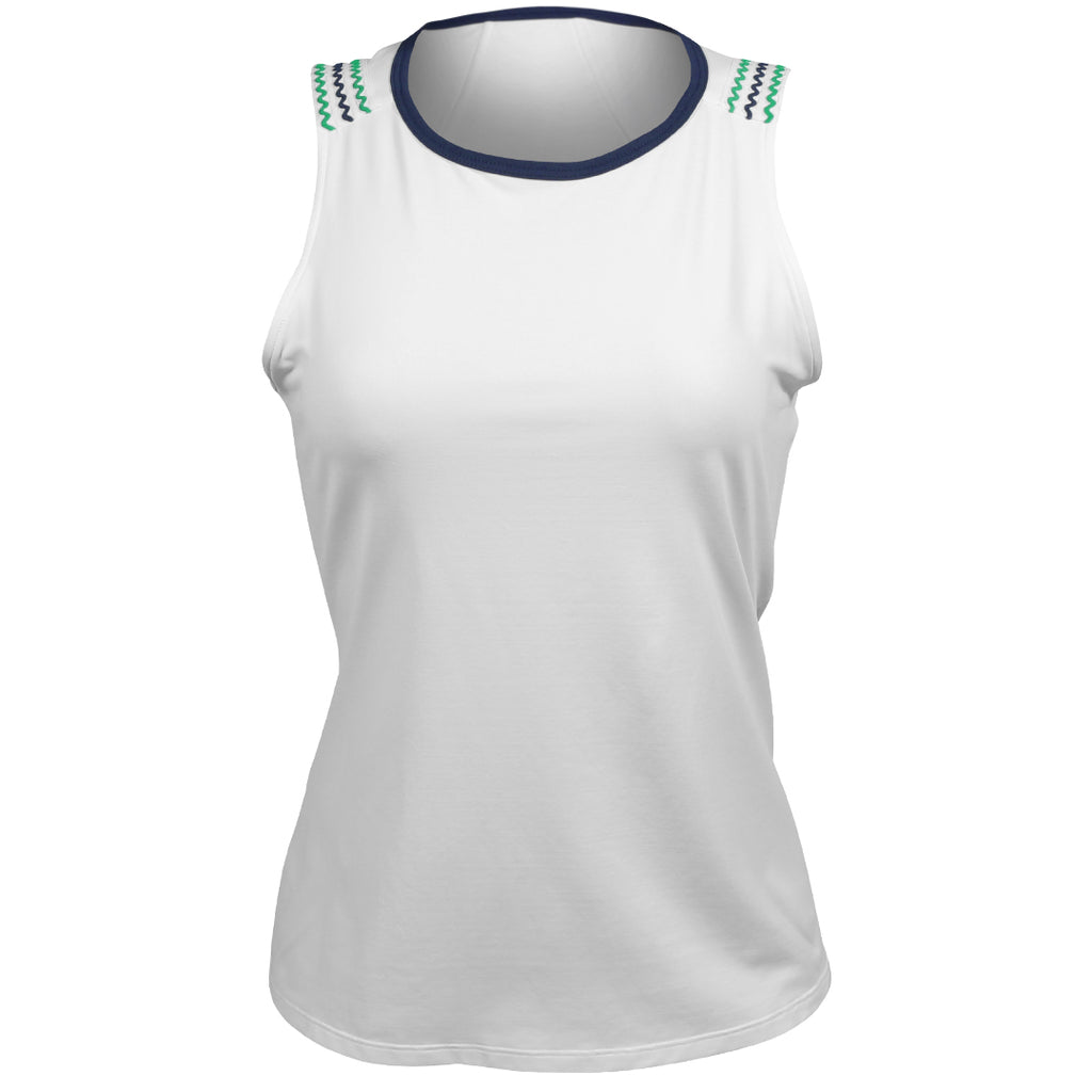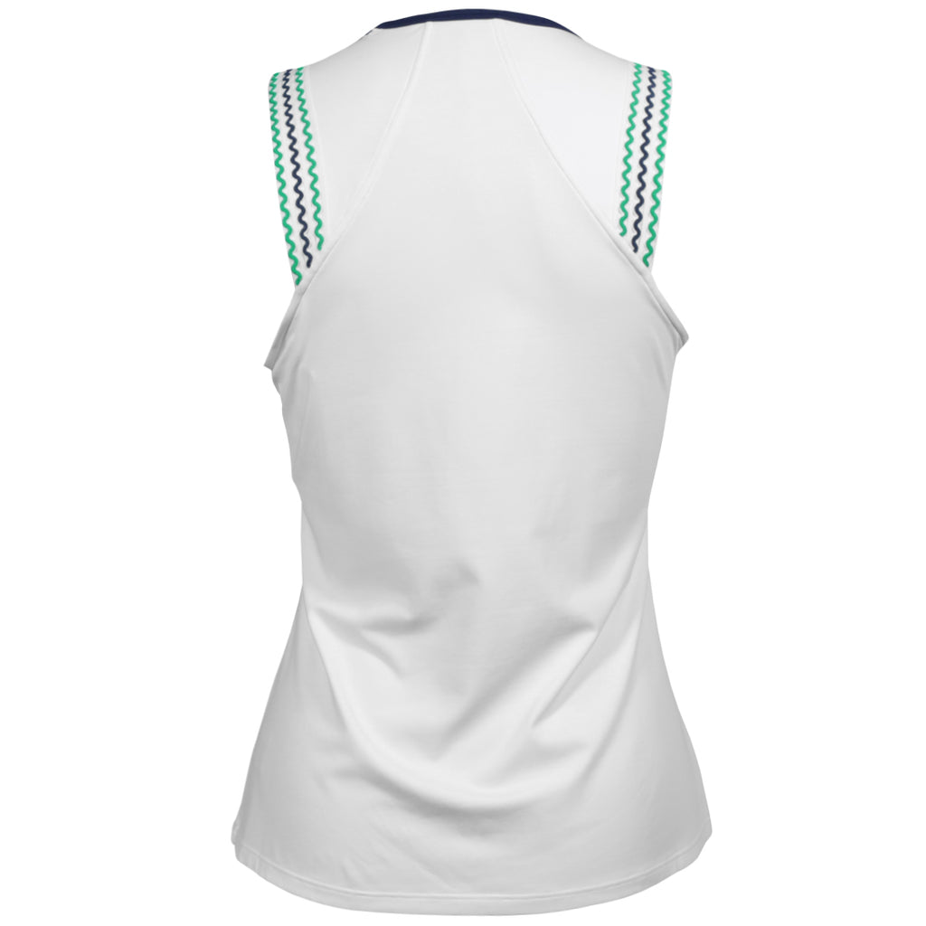 White with blue and green to enhance your on court spirit. Refined and rooted in movement, the Green Spirit Wave Trim Tank channels the pulse of athleticism with every detail. This sleek tank is a modern essential crafted from performance-driven Sofi-Premier fabric for unmatched breathability and softness. The wave trim shoulder detail adds a dynamic, sporty accent—an emblem of motion and energy that captures the soul of the Green Spirit collection. A 25" length offers extra coverage and a flattering silhouette, perfect for tennis or high-performance days off the court.