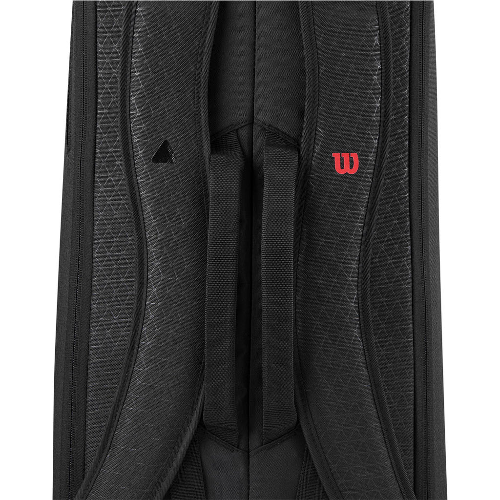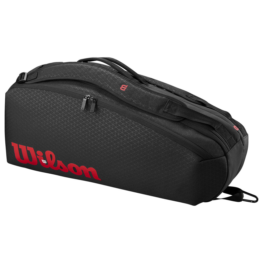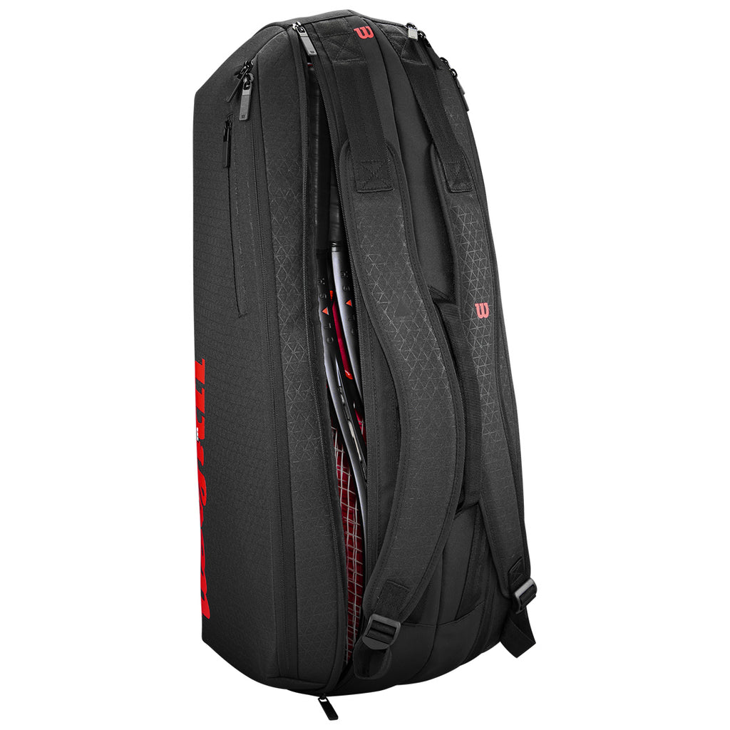 Bold design on a Clash inspired tennis bag. The ideal accessory to match the game-enhancing racket franchise, the Clash V3 Super Tour bag combines a bold, dynamic design with uber-functional utility features to give tennis players an organizational advantage. This Super Tour 6 Pack holds up to six tennis racquets in two large compartments, plus apparel and other equipment. It's crafted from premium fabric embellished with the subtle triangle pattern from the latest Clash design. Additional features include three exterior side pockets for storing smaller personal items and valuables and a dual-carry system that includes both a grab handle and adjustable backpack straps. Made from durable, easy-to-clean polyester, it includes a triangular carabiner that embodies the Clash V3 look and functions as a fence hanger.