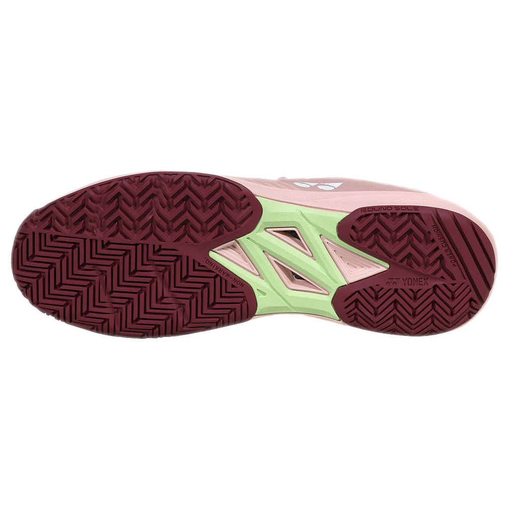 In cool smoke pink, this is a great shoe for tennis. The Yonex Women's Power Cushion Sonicage is a lightweight, comfortable tennis shoe designed for recreational and intermediate players seeking support for all court movements. It features the Power Cushion+ midsole, which absorbs shock and reverses impact energy for smooth transitions. The FlexQuip Durable Skin evenly distributes natural pressure from on-court movements while providing extra durability during aggressive play. A seamless tongue construction ensures a smooth, comfortable fit, and the TPU shank extends into the forefoot for faster, more stable footwork. The shoe also incorporates a Power Graphite plate to support the arch and reduce stress on the hips and knees during long hours of play. The Round Sole design offers all-around support for quick and smooth footwork, ensuring maximum energy transfer.